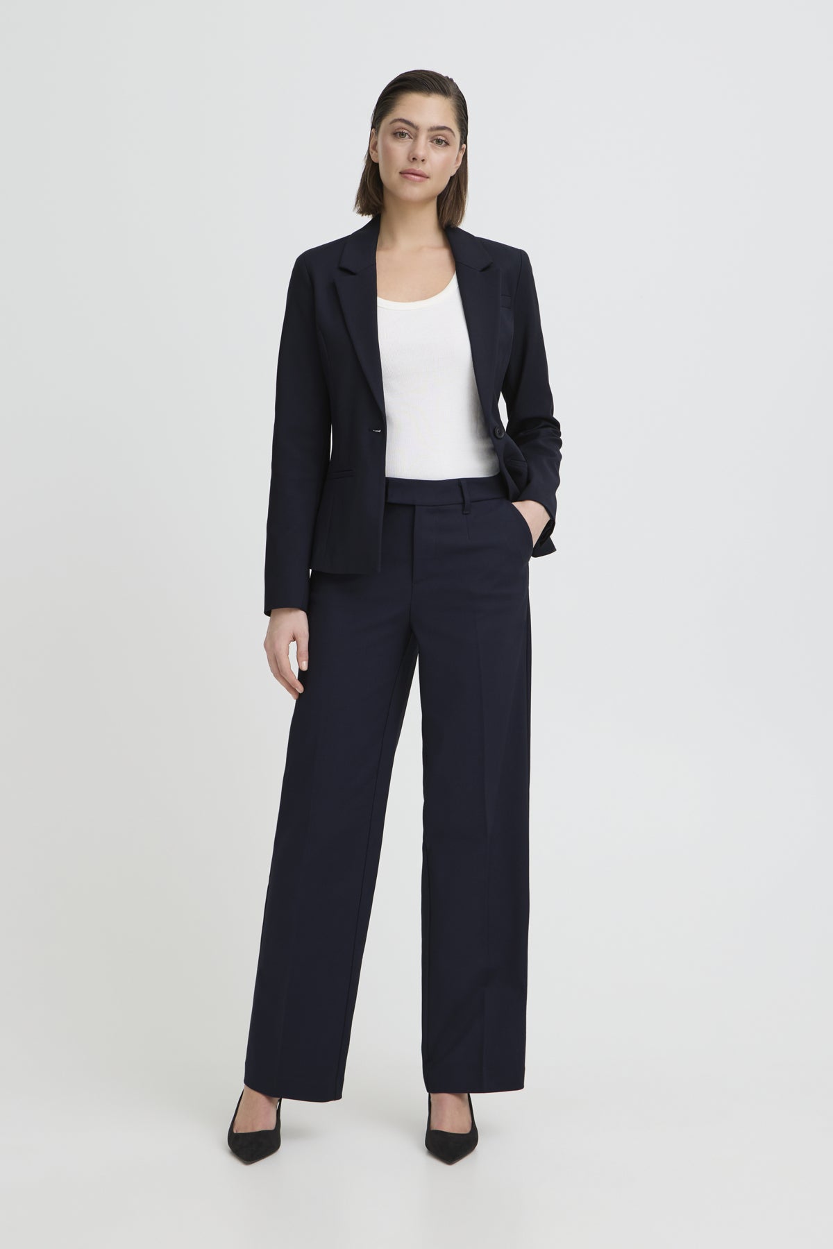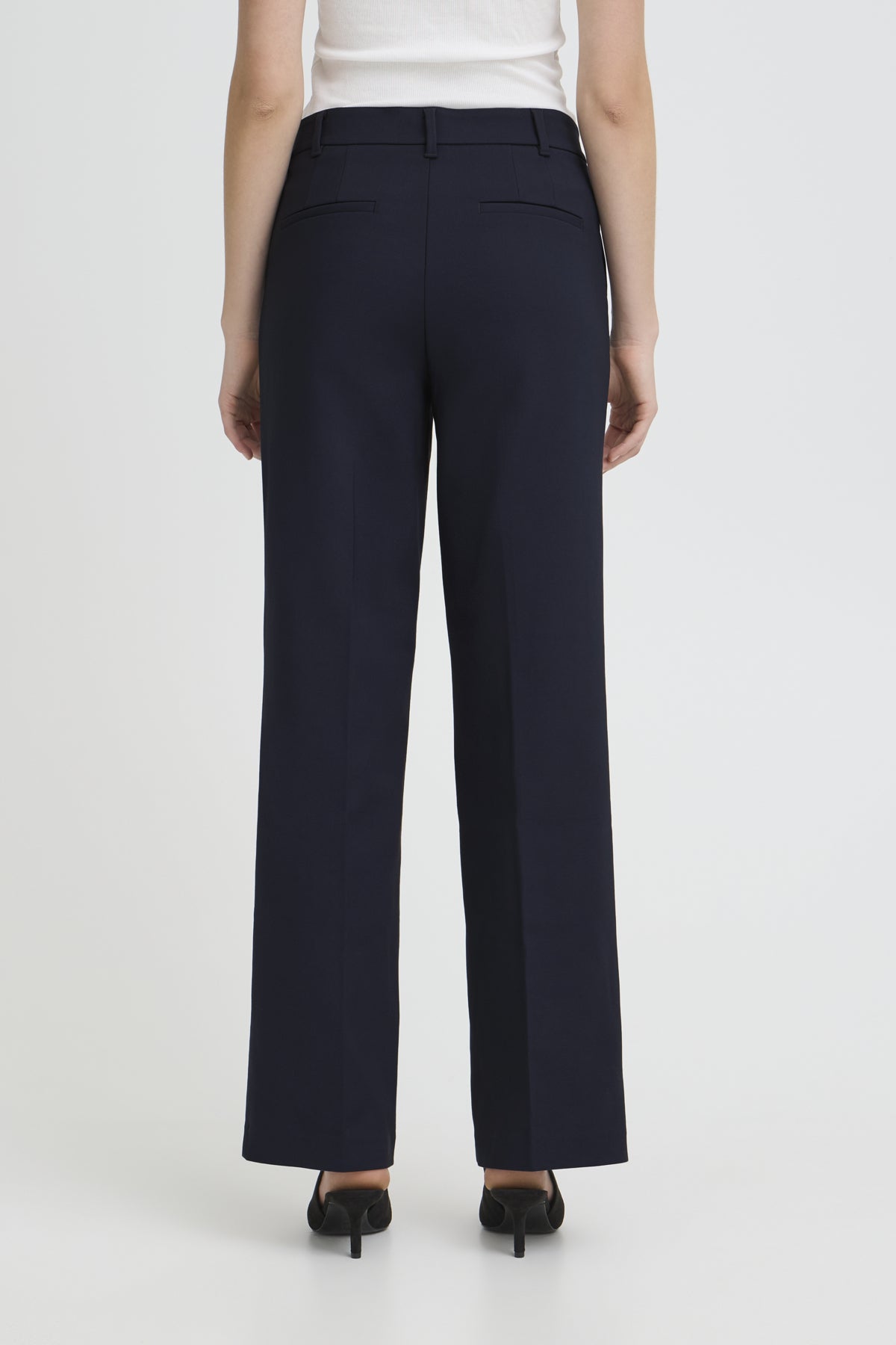 En flott dressbukse med vide ben. Skrå lommer foran og fuske lommer bak.