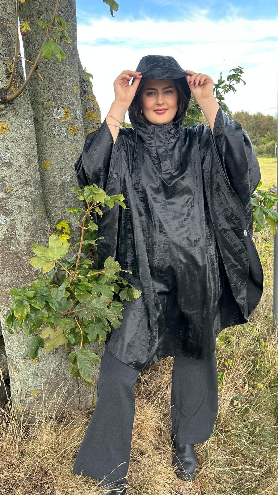 Tøff regn cape med gast hette og åpning i hals som er tett med stoff.