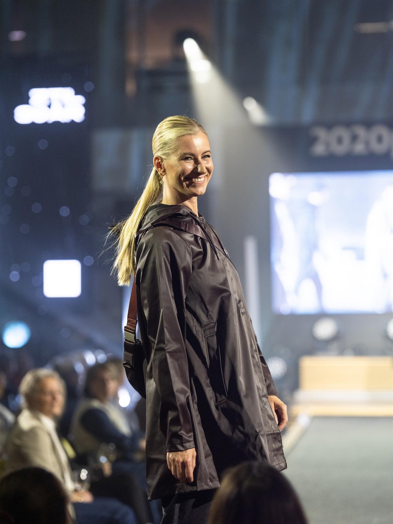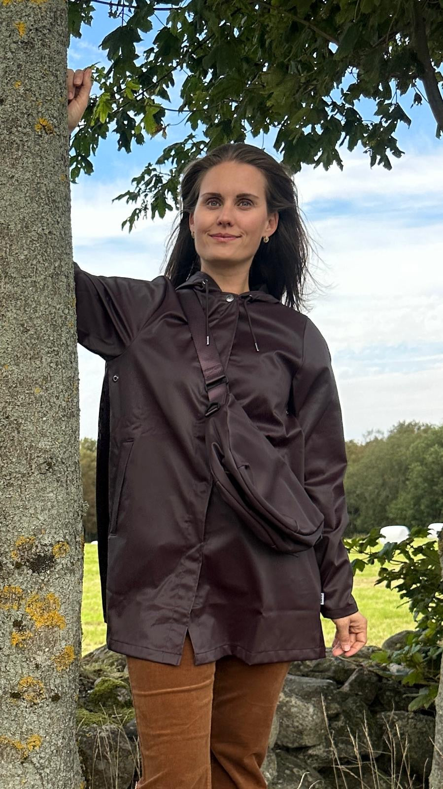 Regn jakke i A fasong med løst belte. Jakken har fast hette og lukkes med trykknapper.