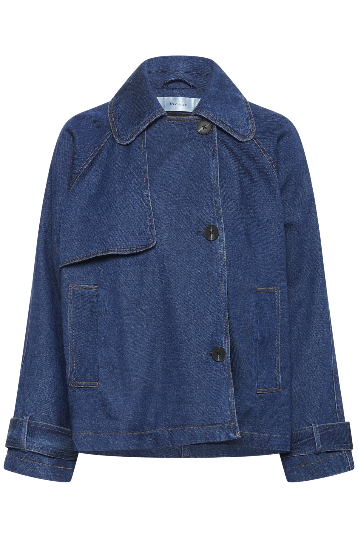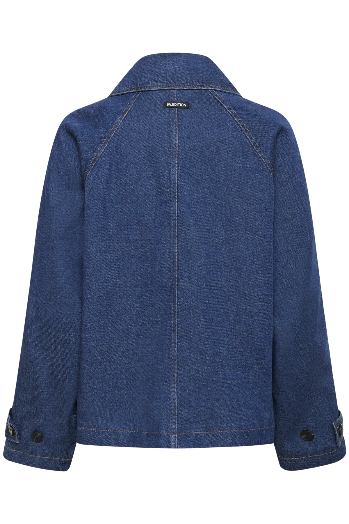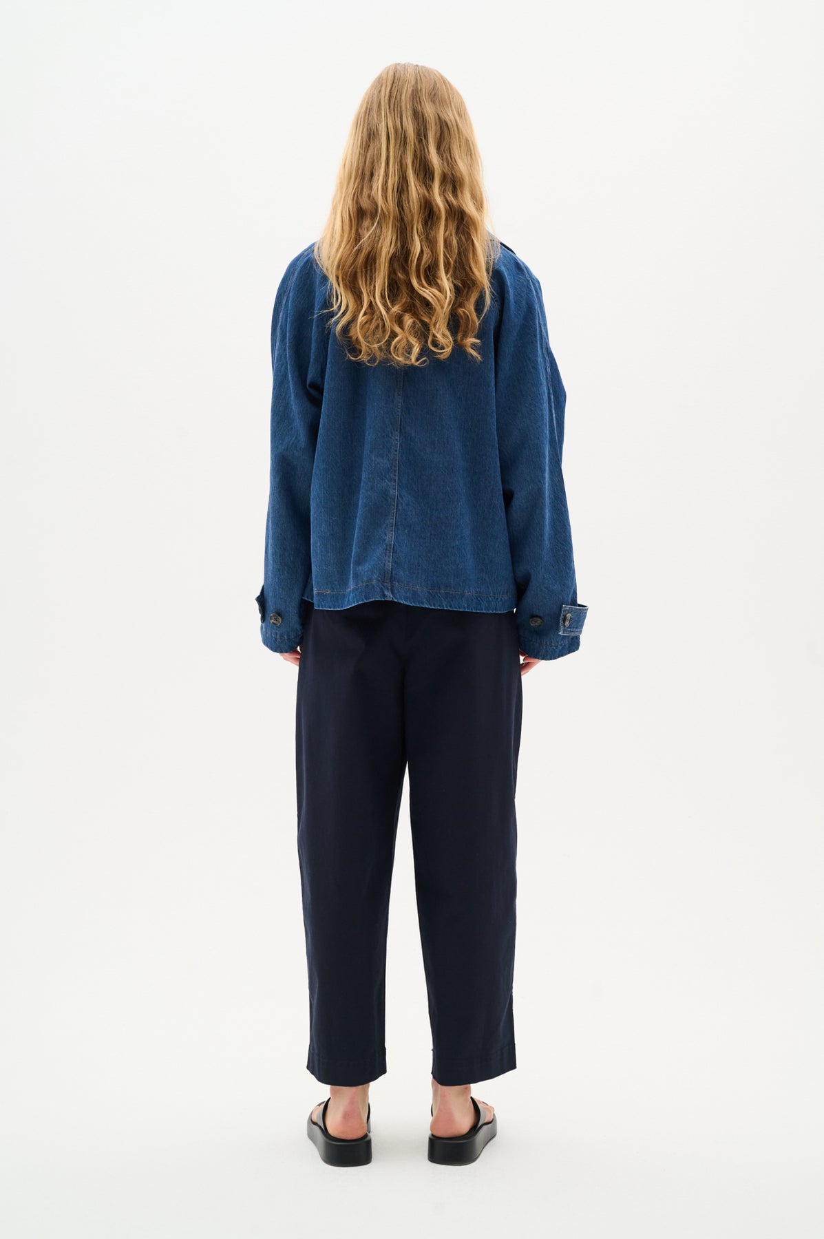 Denimjakke med boxy passform, bred krage og markant frontflapp. Senkede skuldre, rett kant og påsydde sidelommer setter stilen.