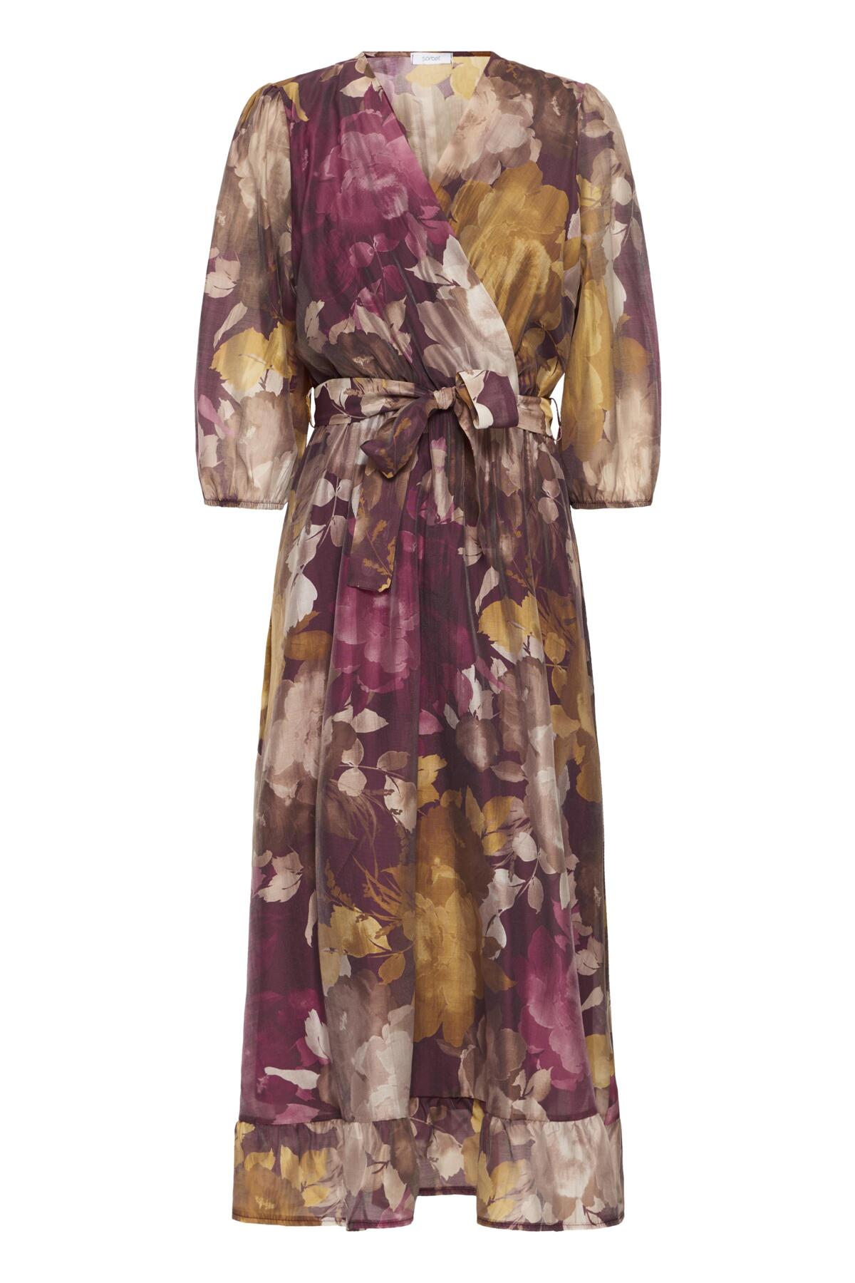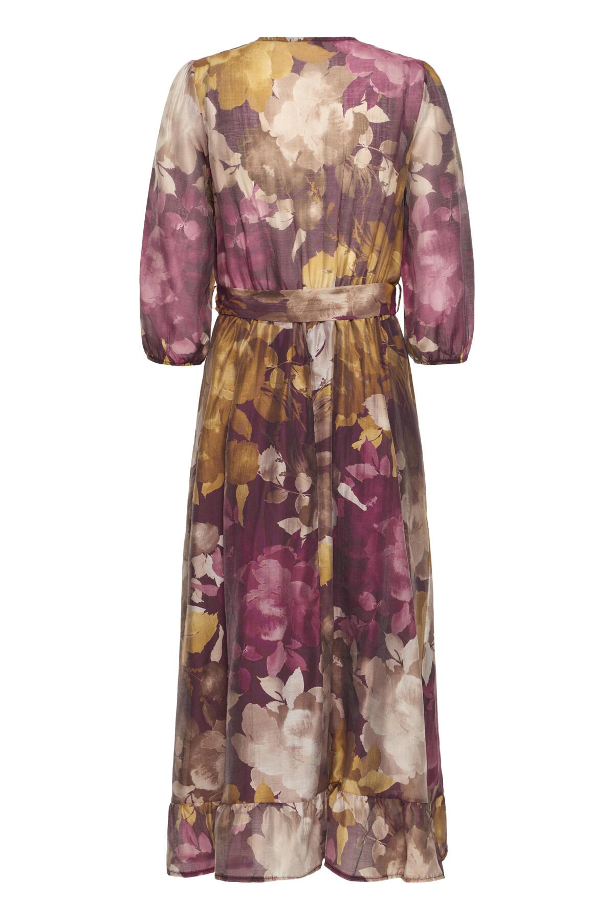 Lekker kjole med V hals og fastsydd omslagsmodell med strikk i livet og løst belte. Kjolen er foret og har 3/4 lange ermer med strikk nede. Kjolen avskluttes med en liten kappe nederst.