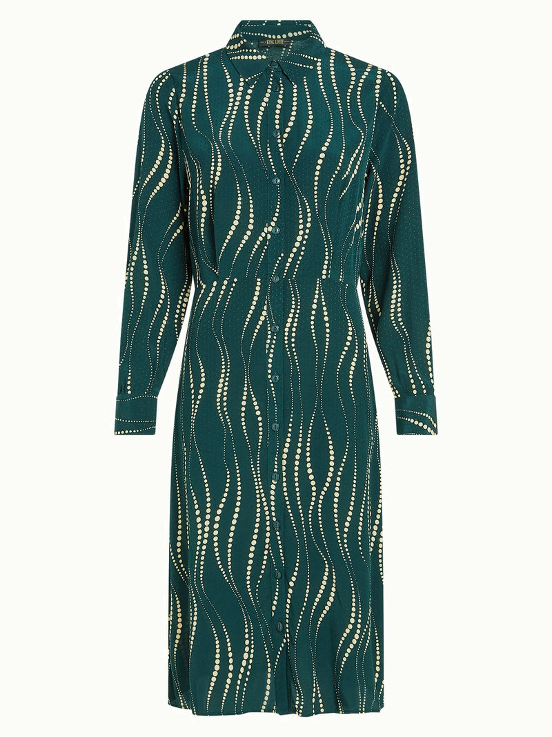 Herlig kjole med avdelt liv og lange ermer med mansjett nederst. Kjolen har krage og knapping foran som går helt ned.
