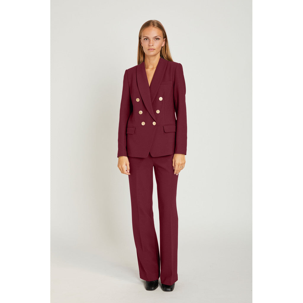 Flottblazer i høstens løkre burgunder fargen. Jakken er dobbelspendt med gull knapper og svakt avrundet nederst. Jakken er foret. Bukse hører til.