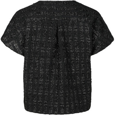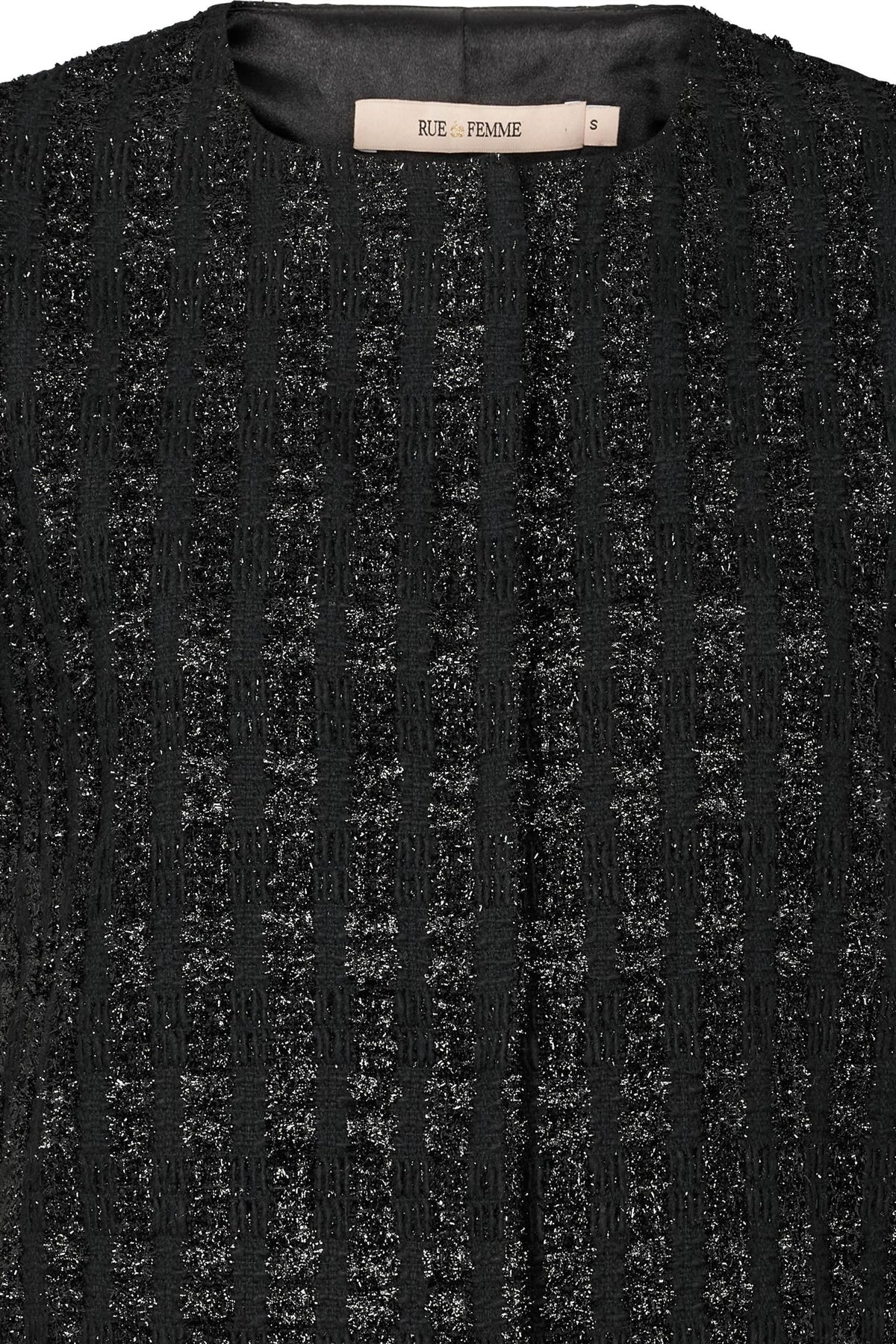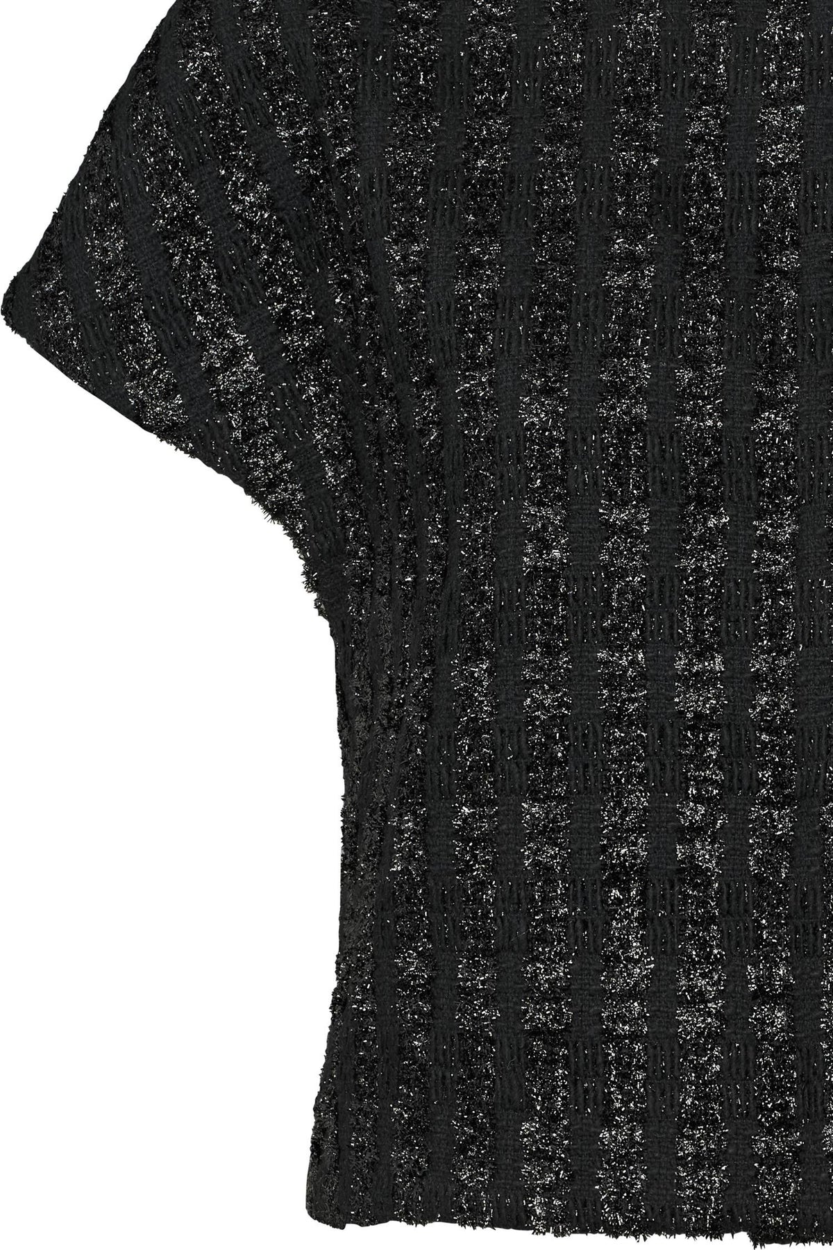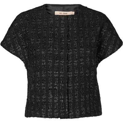 Tøff vest med sølv tråder i stoffet. Vesten har rund hals og lukkes med trykknapper.