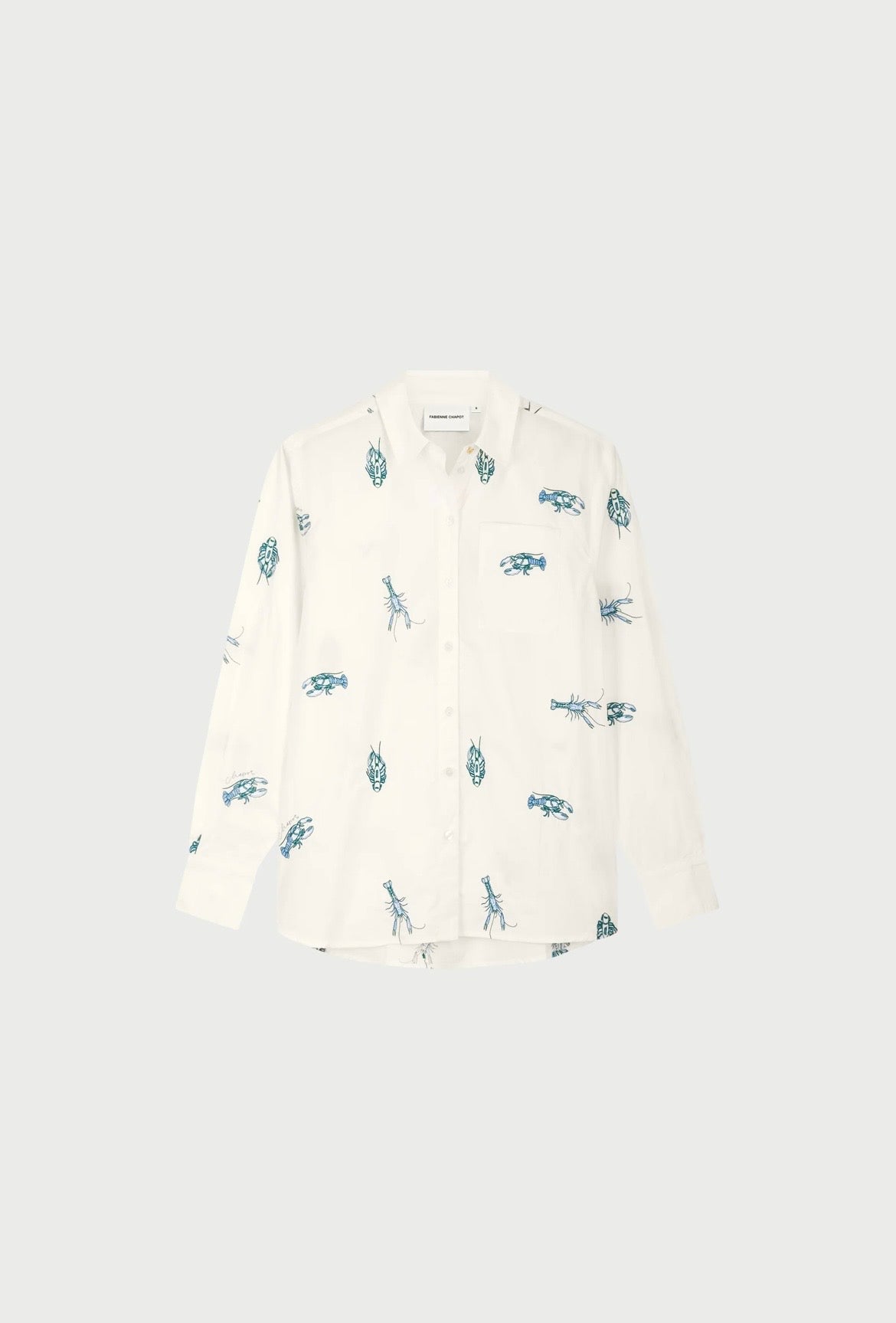 Tøff skjorte med sjøkreps broderier og med klassisk krage og knapper helt ned. Fin pyntaknapp i gull øverst i halsen.