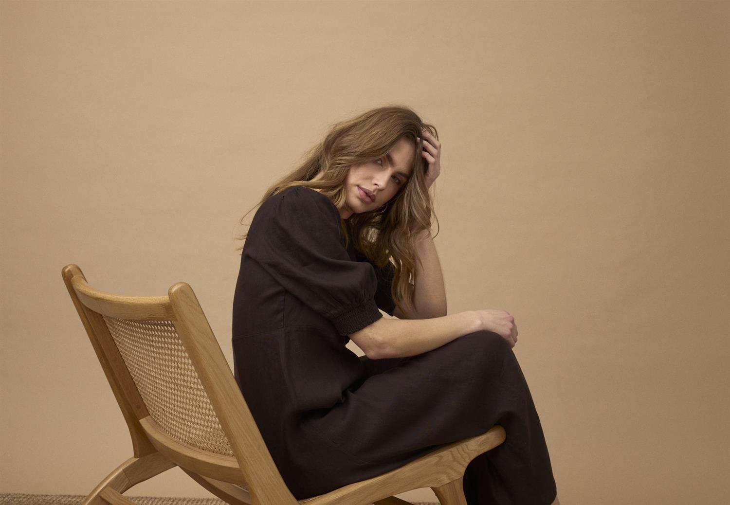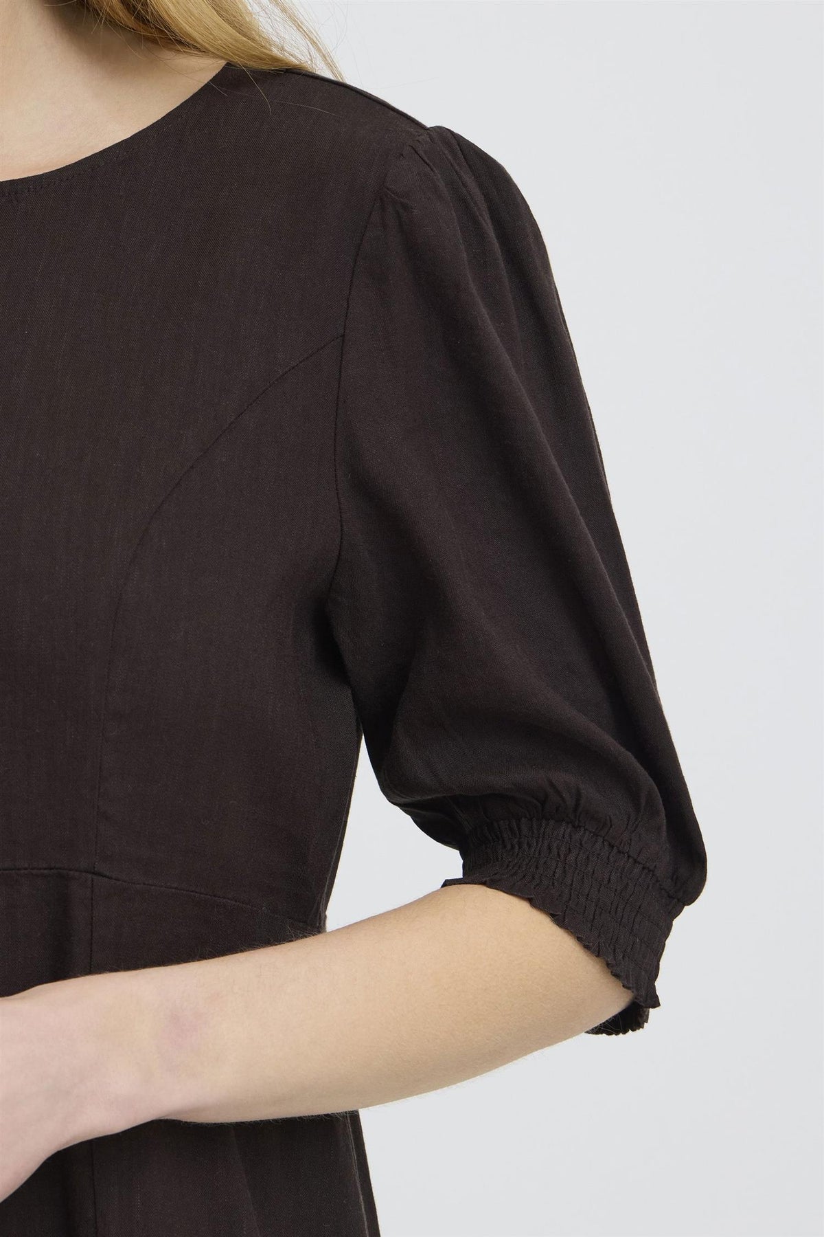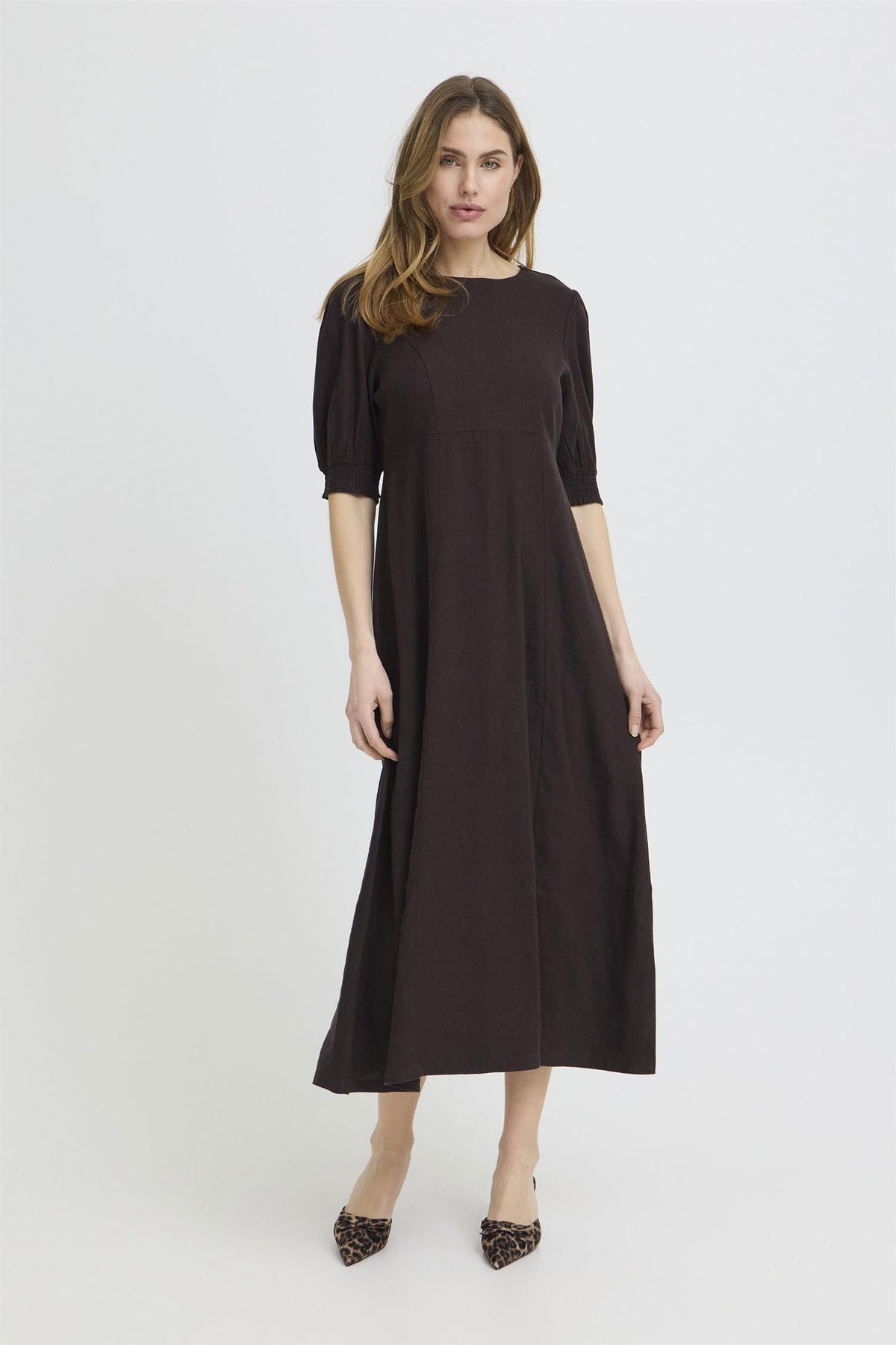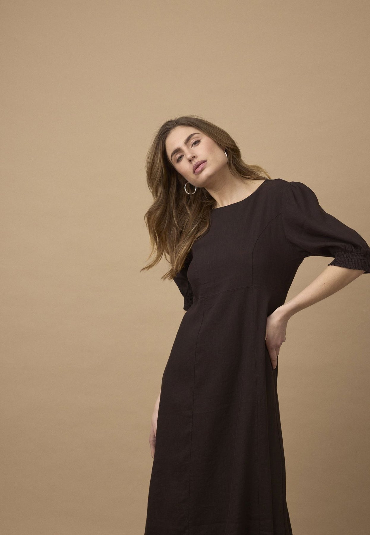 Materiale: 52% lin, 45% viskose, 3% elastan - Lin gir en lett og pustende kvalitet, mens viskose tilfører mykhet og glans. Elastan gir kjolen en behagelig stretch for bedre bevegelse.