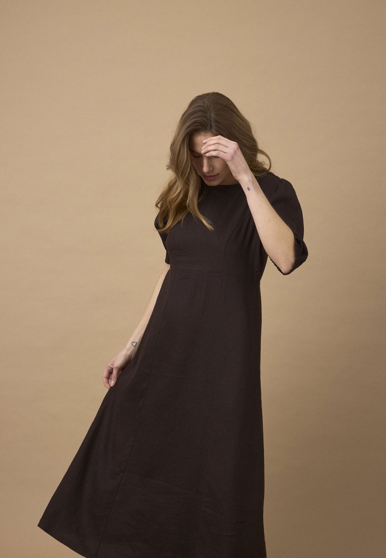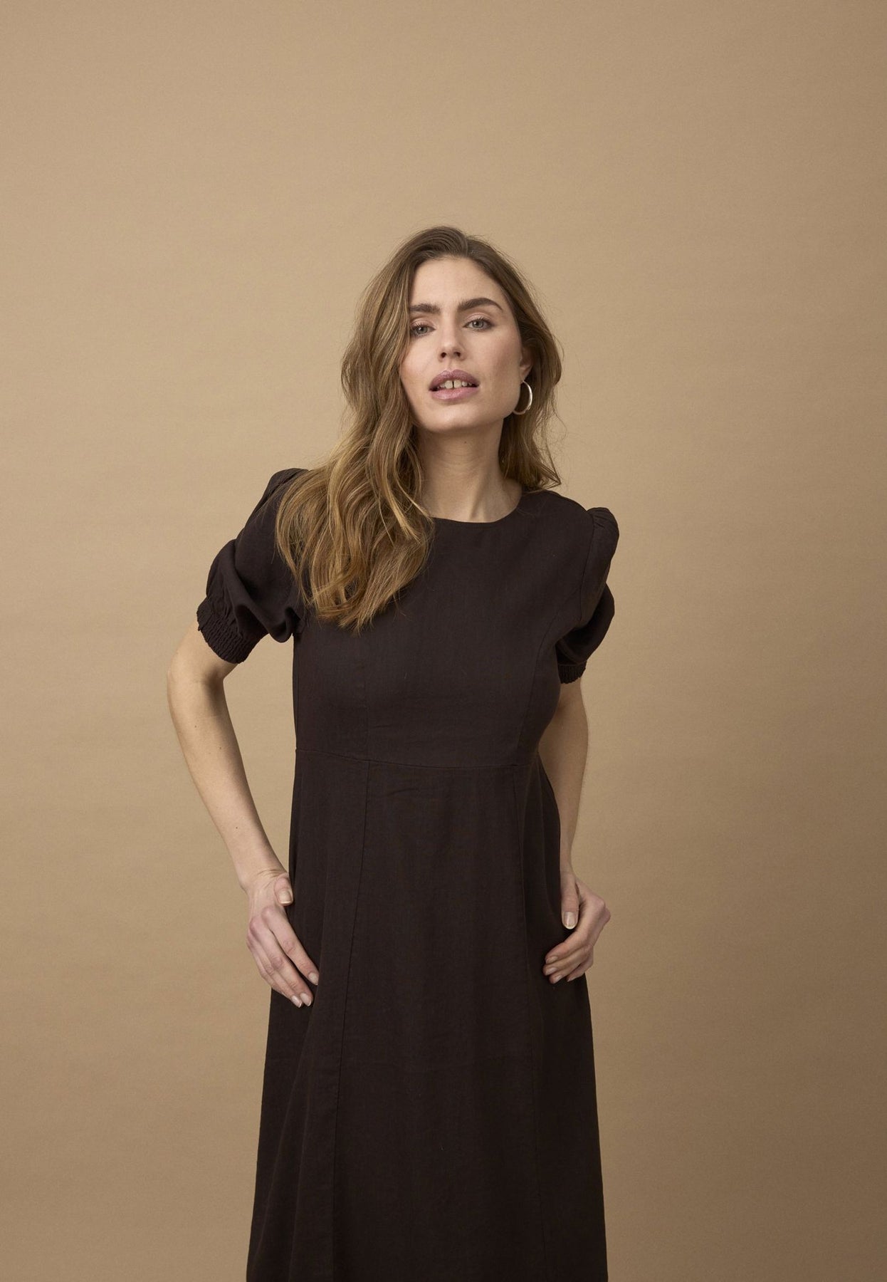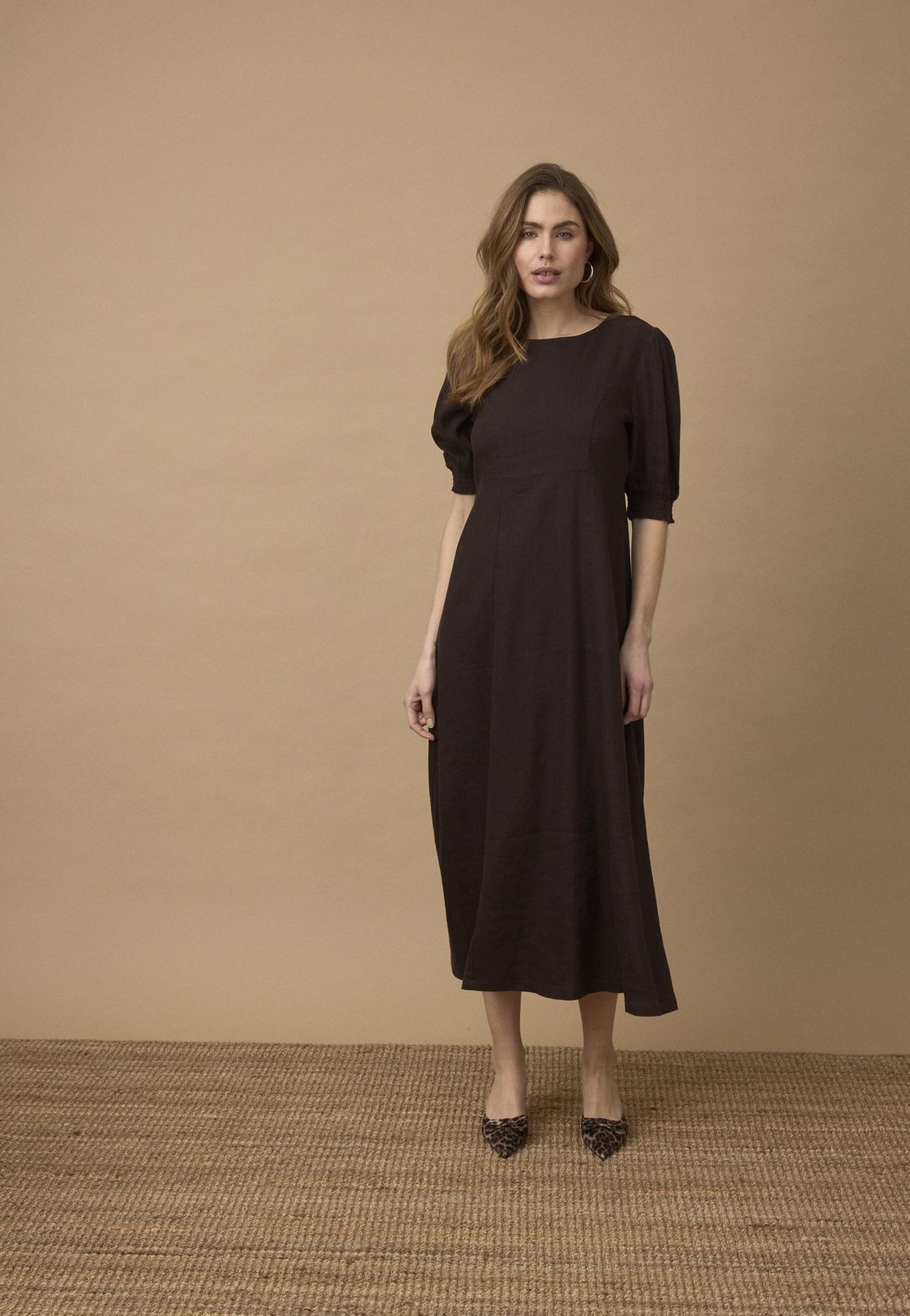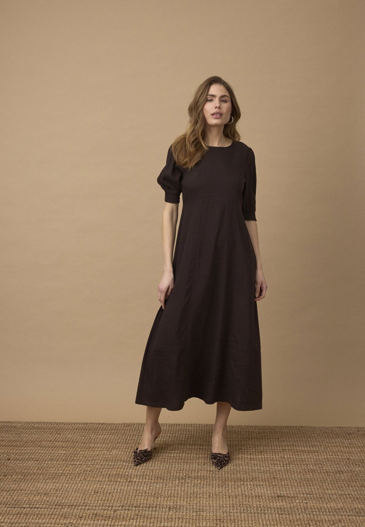 PZLUCA lang kjole i espresso er et elegant valg for enhver anledning. Den feminine passformen og midi-lengden gir en tidløs stil som passer perfekt til sommerens varme dager.