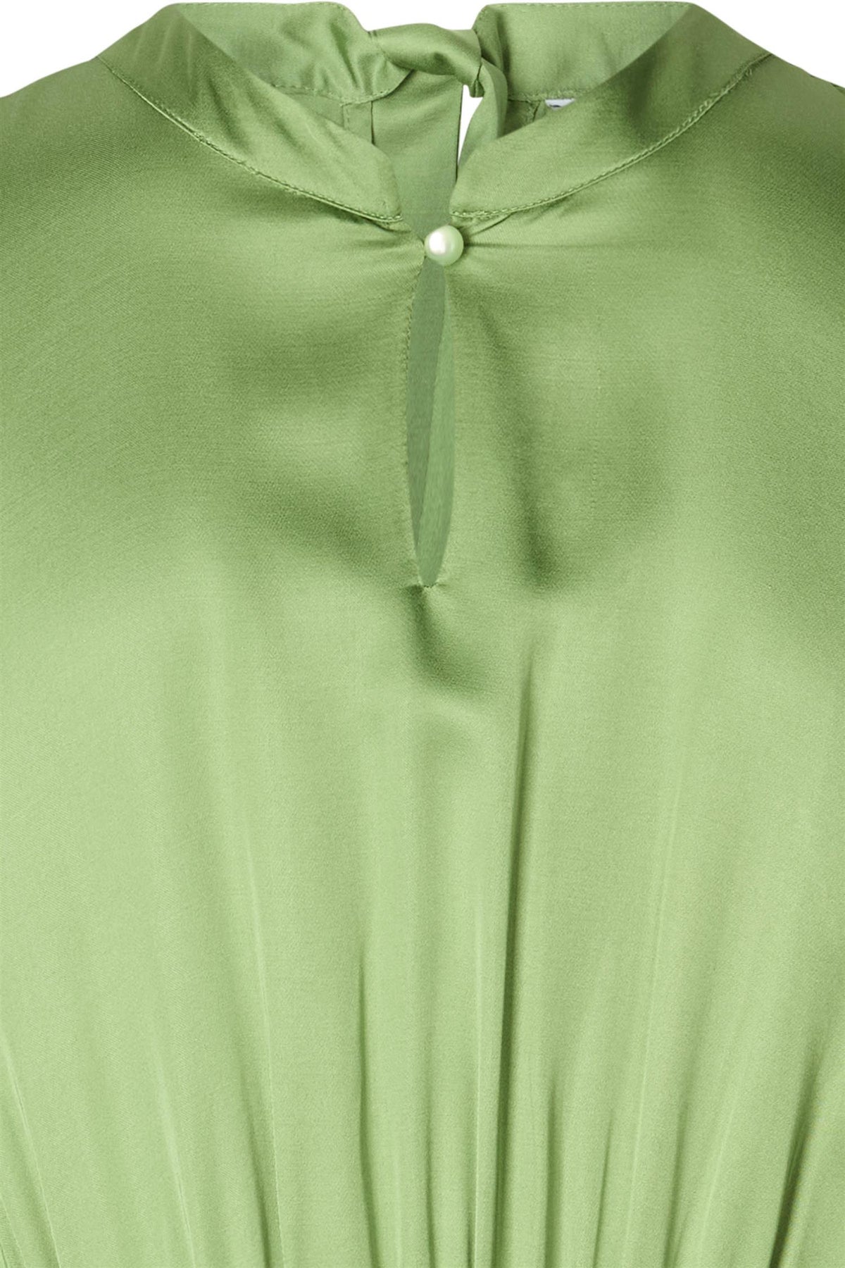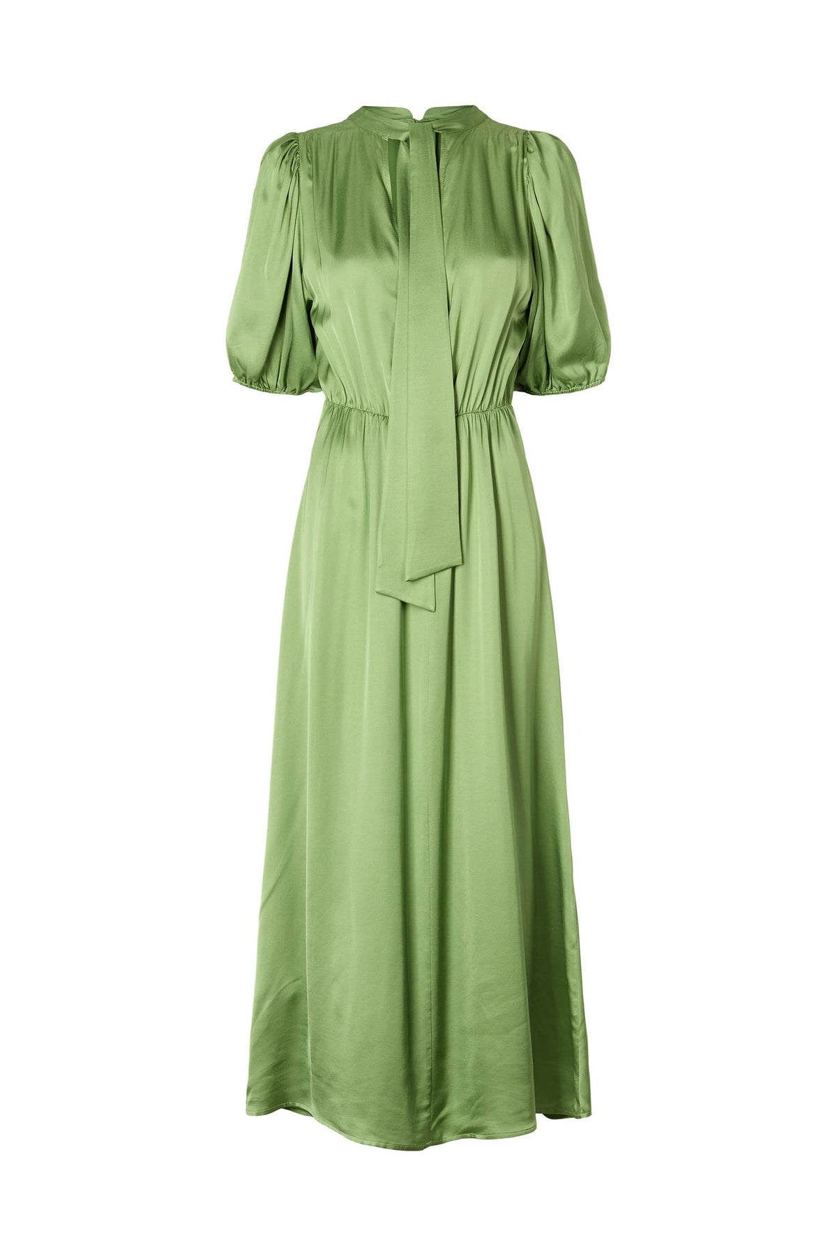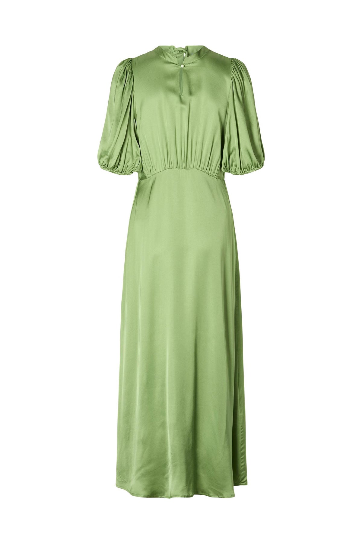 Lekker kjole med rund hals og en gull knapp foran. Åpning i nakken med en sløyfe. Kjolen har en flatterende fasong med skjæring under brystet og strikk bak i livet. Kjolen har korte puffermern med stikk avslutning.