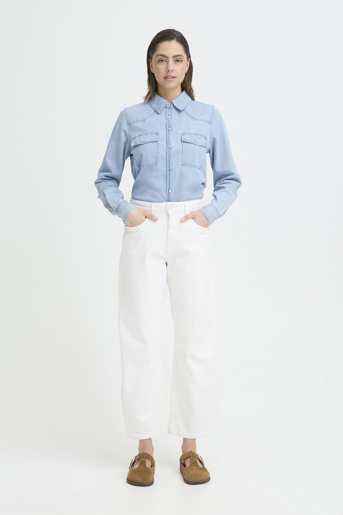 PZANNI ECRU HW JEANS BARREL er et stilrent valg for den moderne kvinnen. Med en høy midje og ankel lengde, gir disse jeansene en flatterende silhuett som passer perfekt til både hverdags og mer formelle anledninger.
