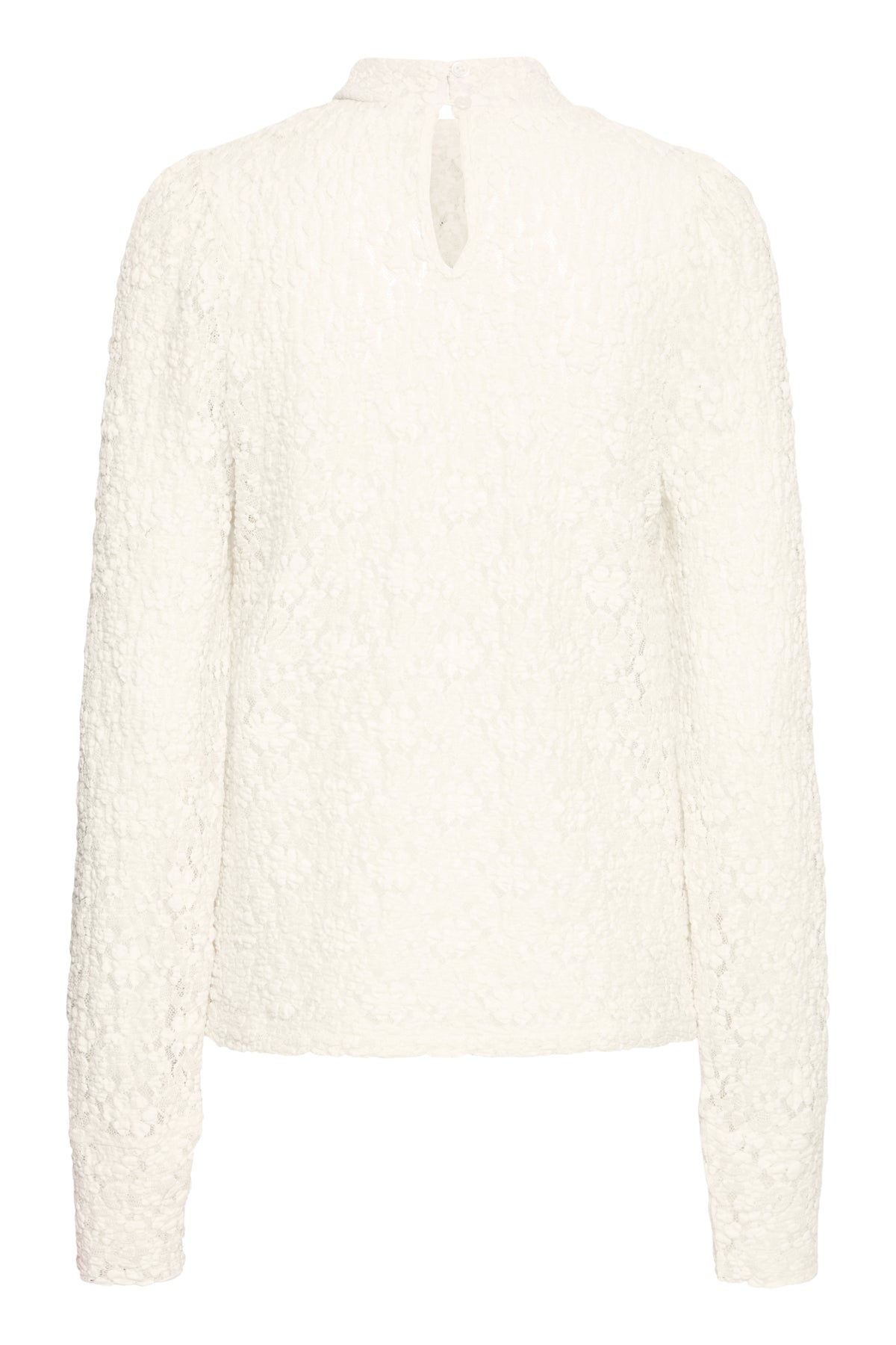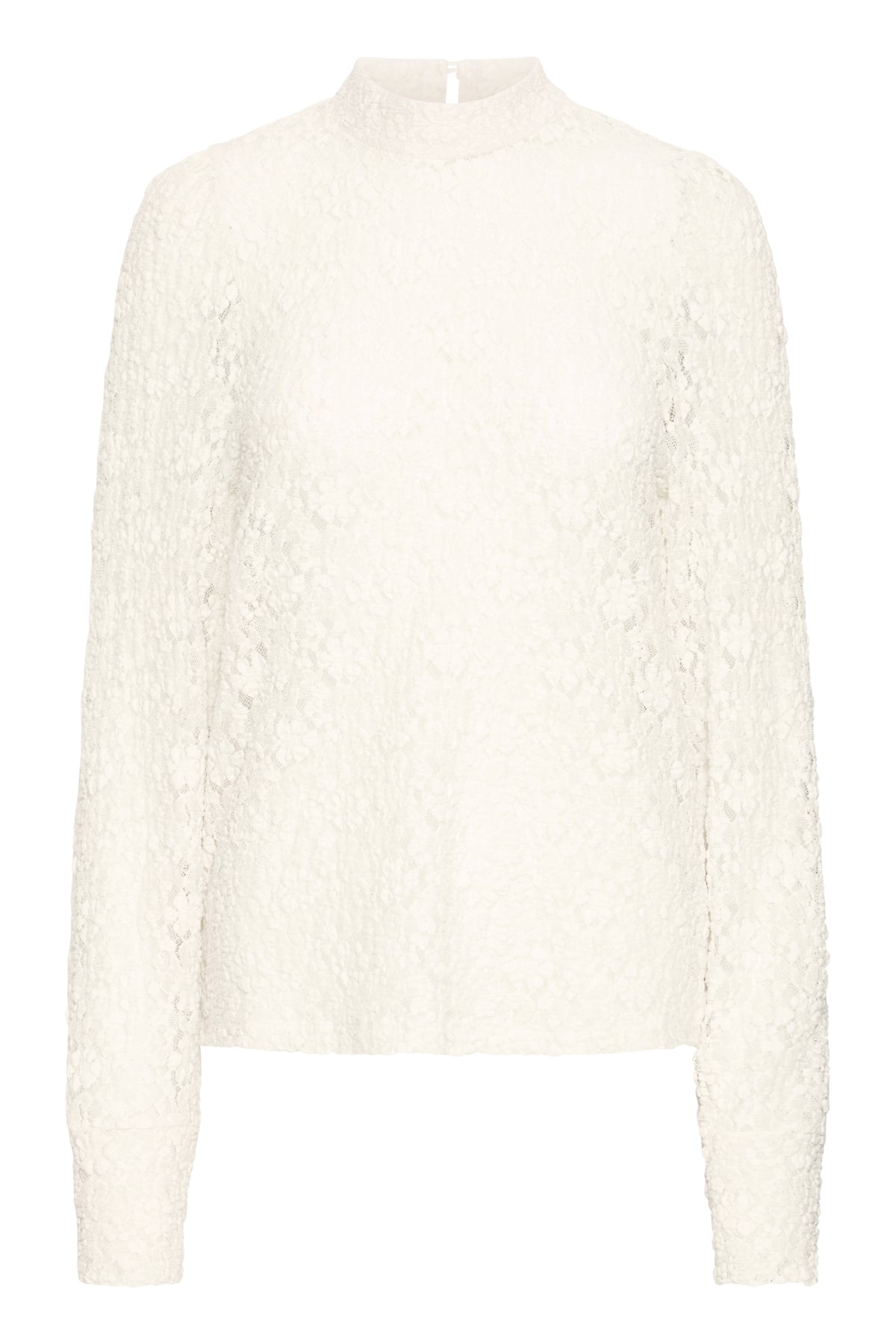 Nydelig bluse fra Pulz, med blonder og rund hals og med en liten ståkrage som lukkes med to knapper bak i nakken.