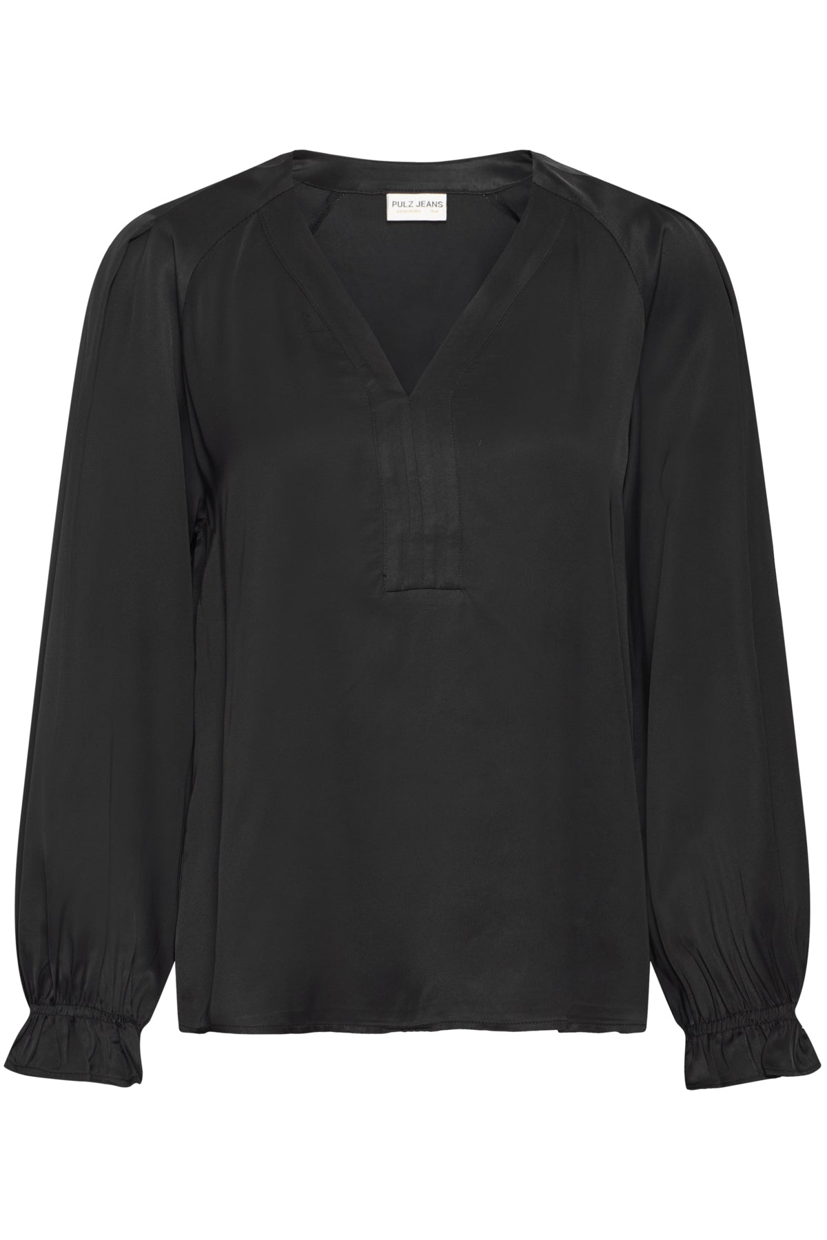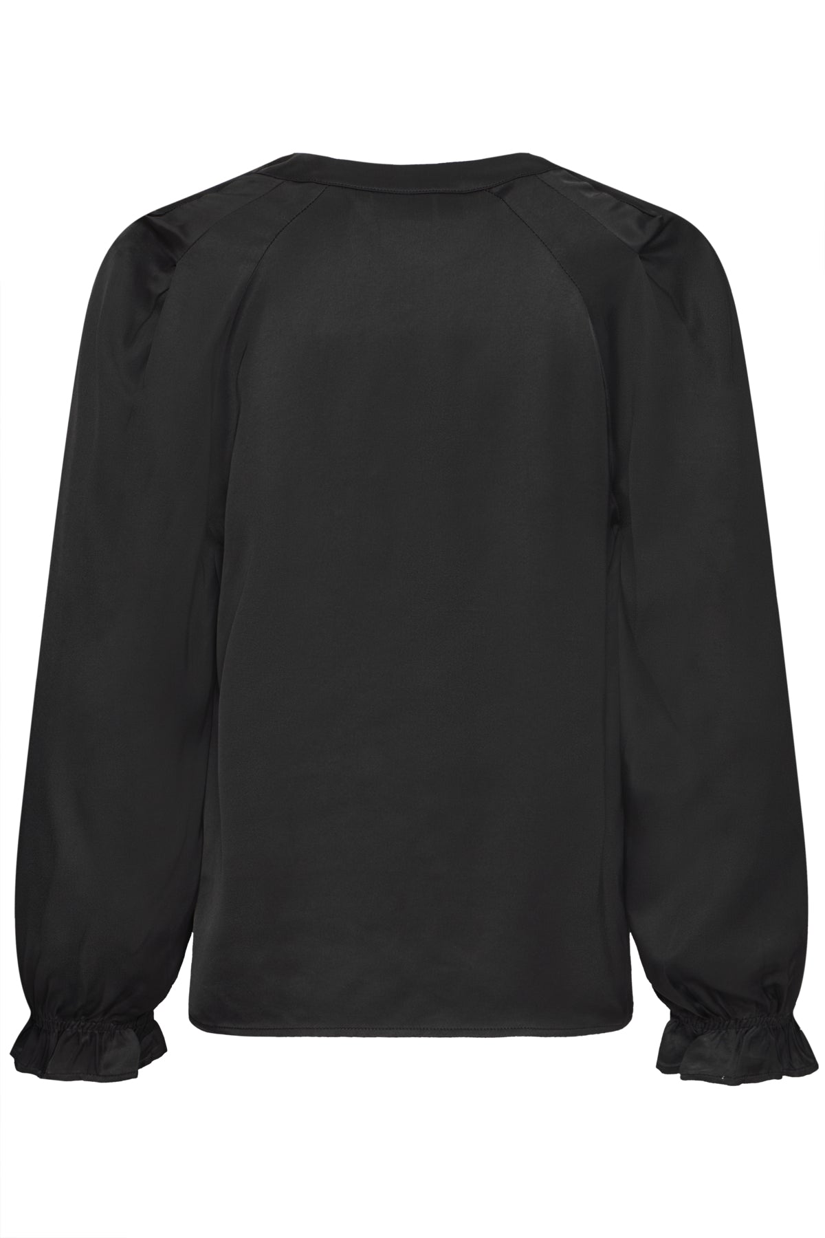 En nydelig bluse med v-hals, rett i modellen og strikk ved ermet.