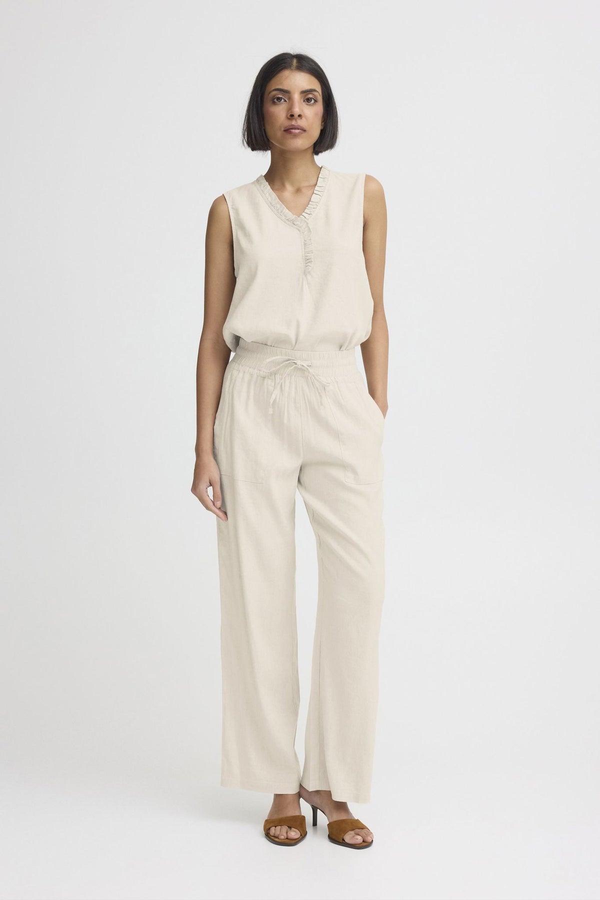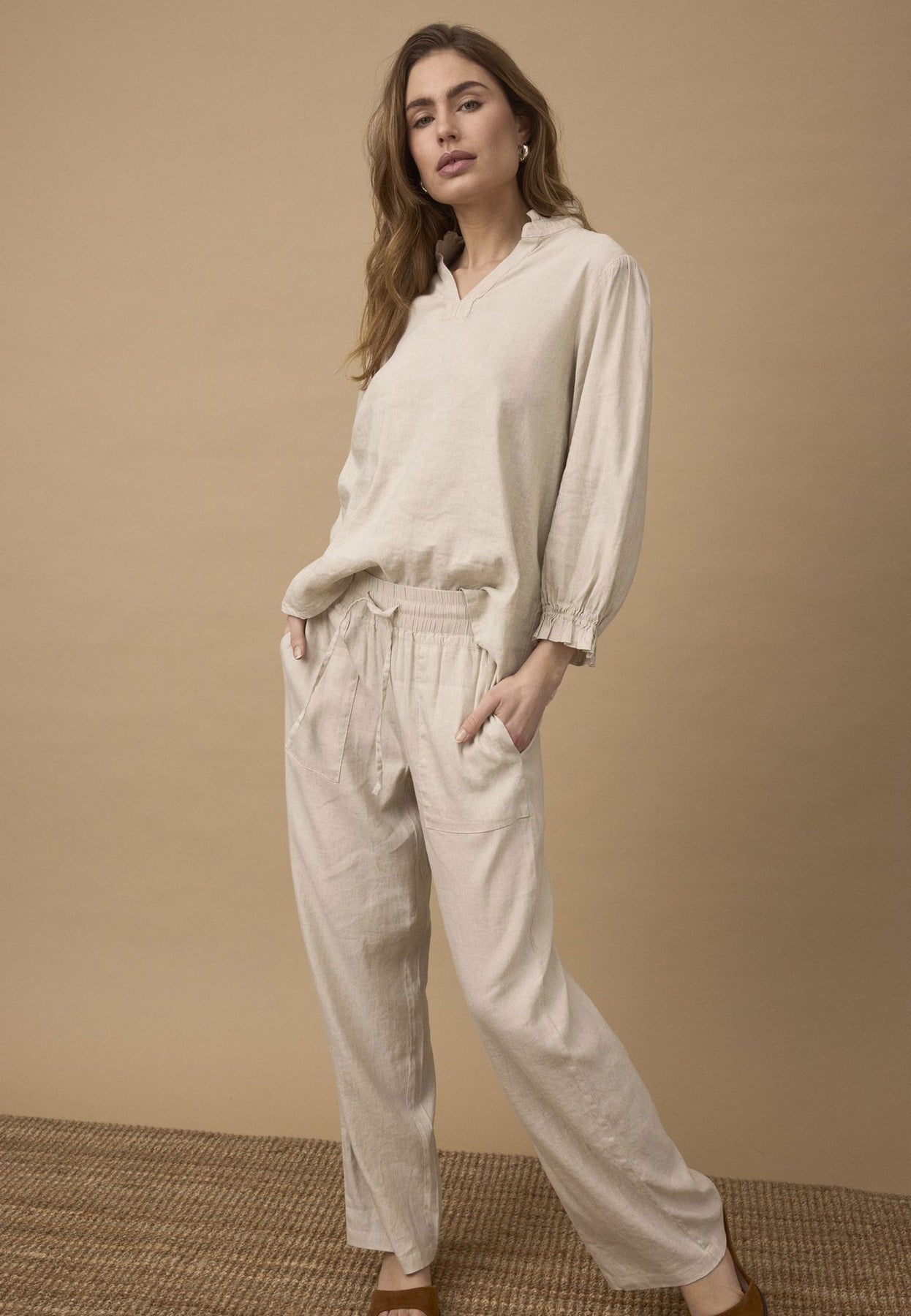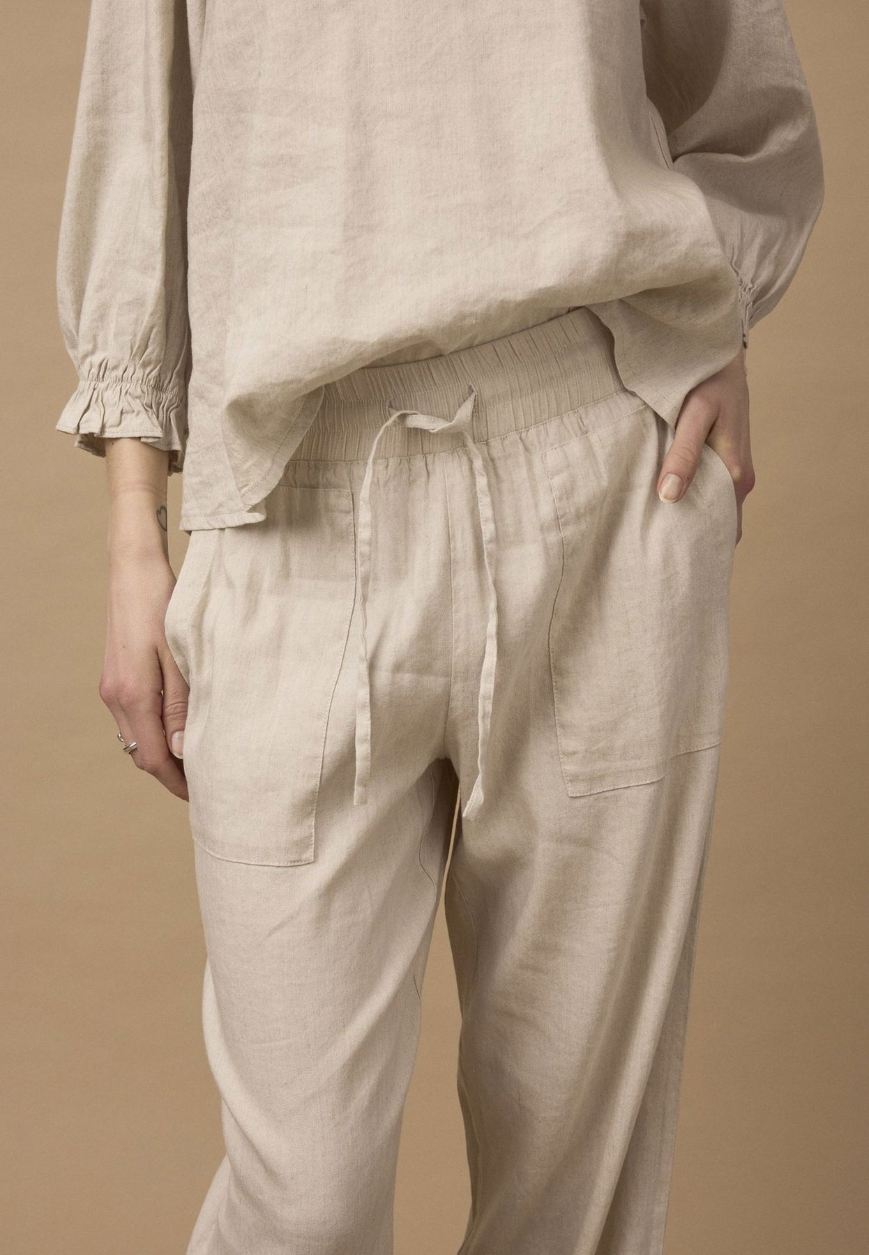 Materiale: 52% Lin, 45% Viskose, 3% Elastan - Lin gir en lett og pustende kvalitet, mens viskose tilfører mykhet og glans. Elastan gir en smule stretch for ekstra komfort.