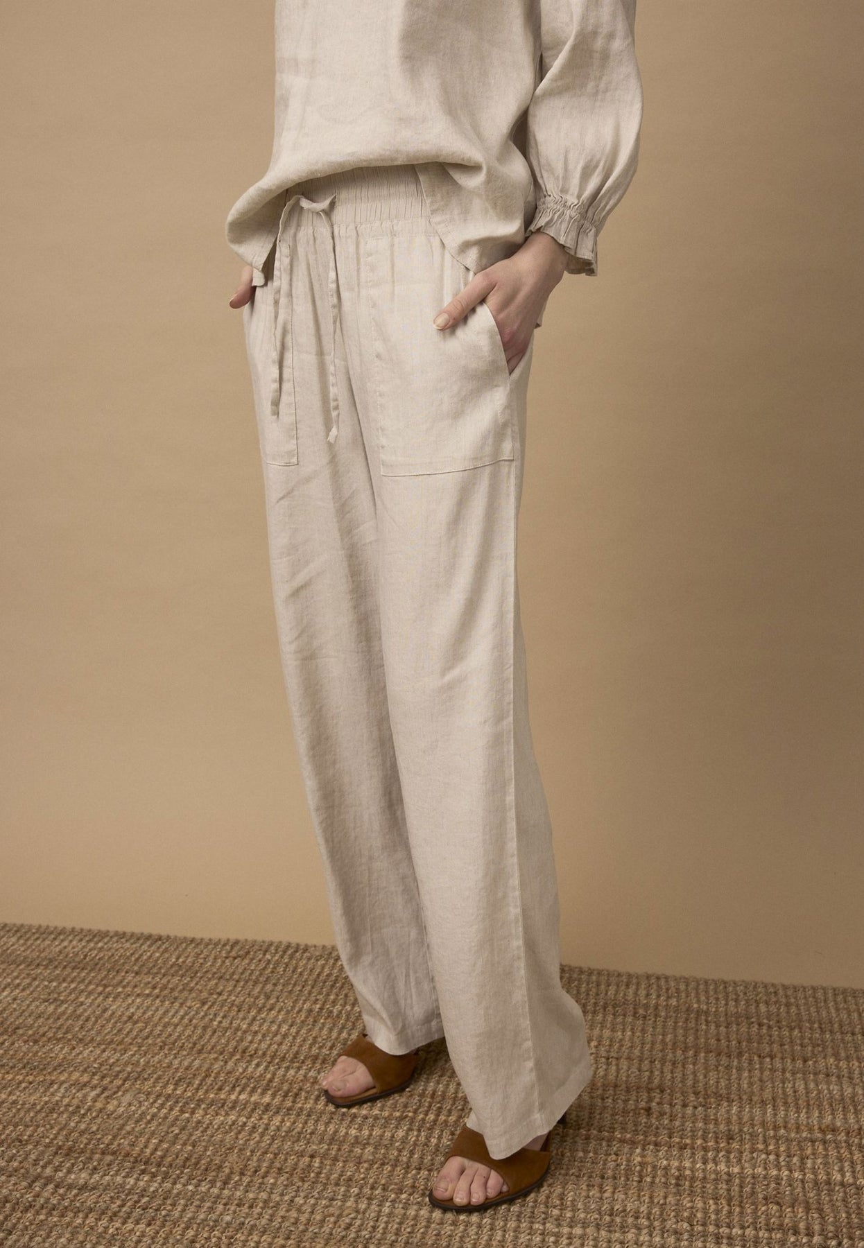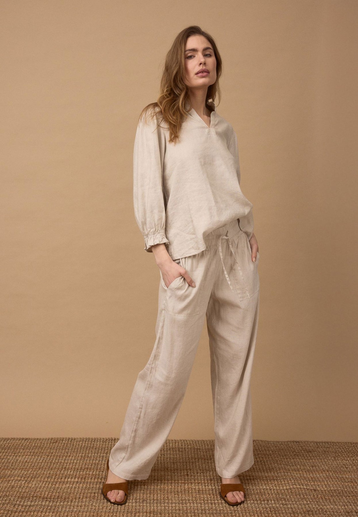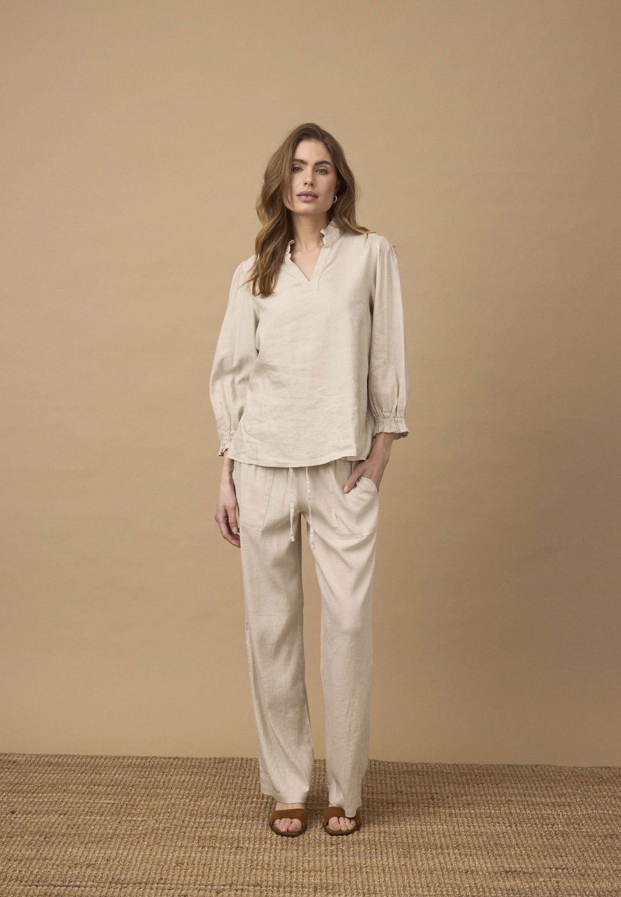 Materiale: 52% Lin, 45% Viskose, 3% Elastan - Lin gir en lett og pustende kvalitet, mens viskose tilfører mykhet og glans. Elastan gir en smule stretch for ekstra komfort.