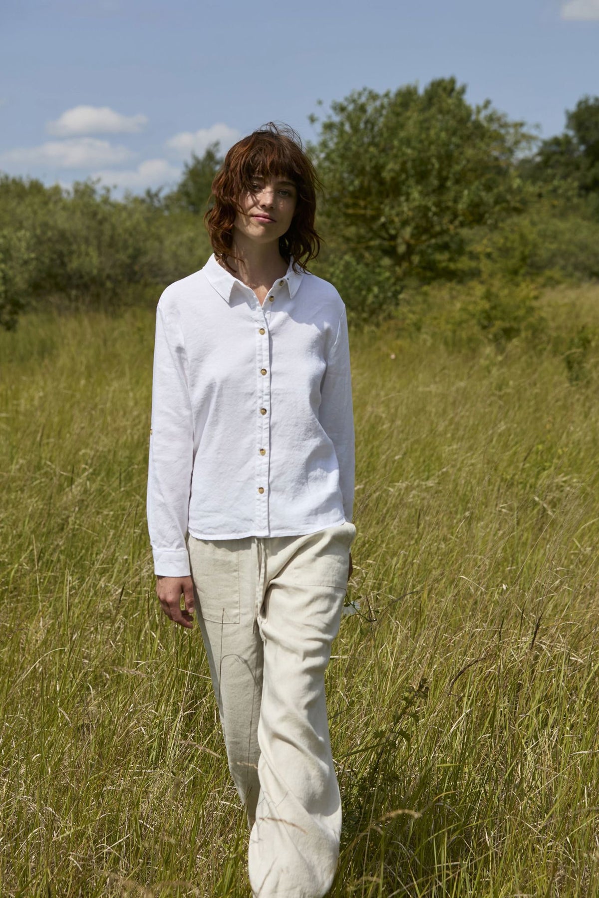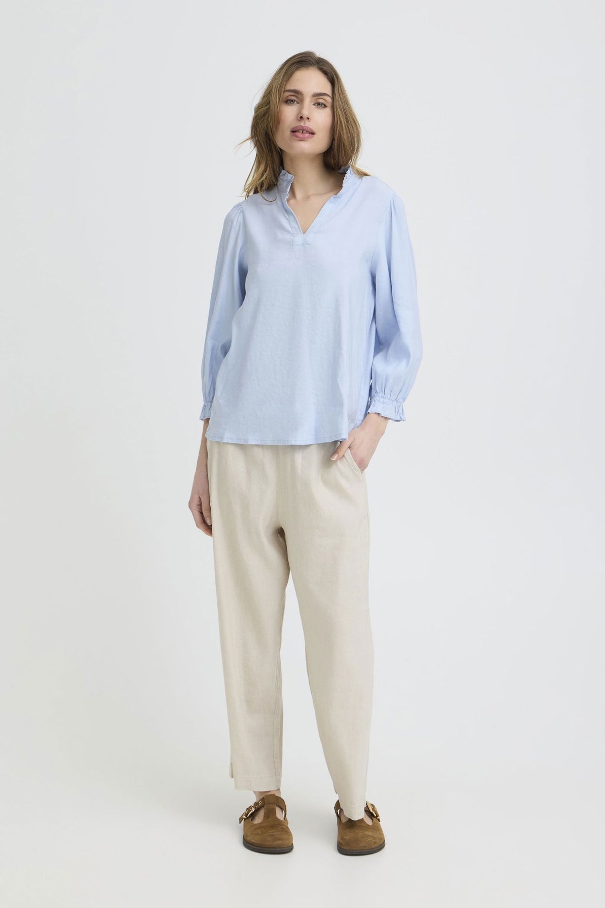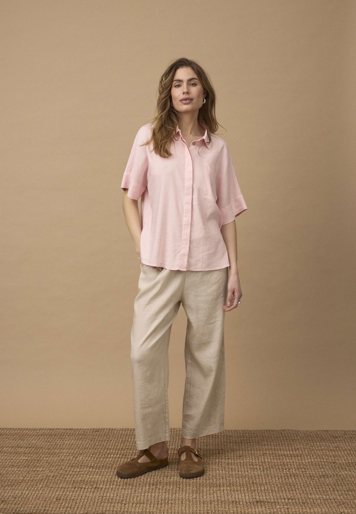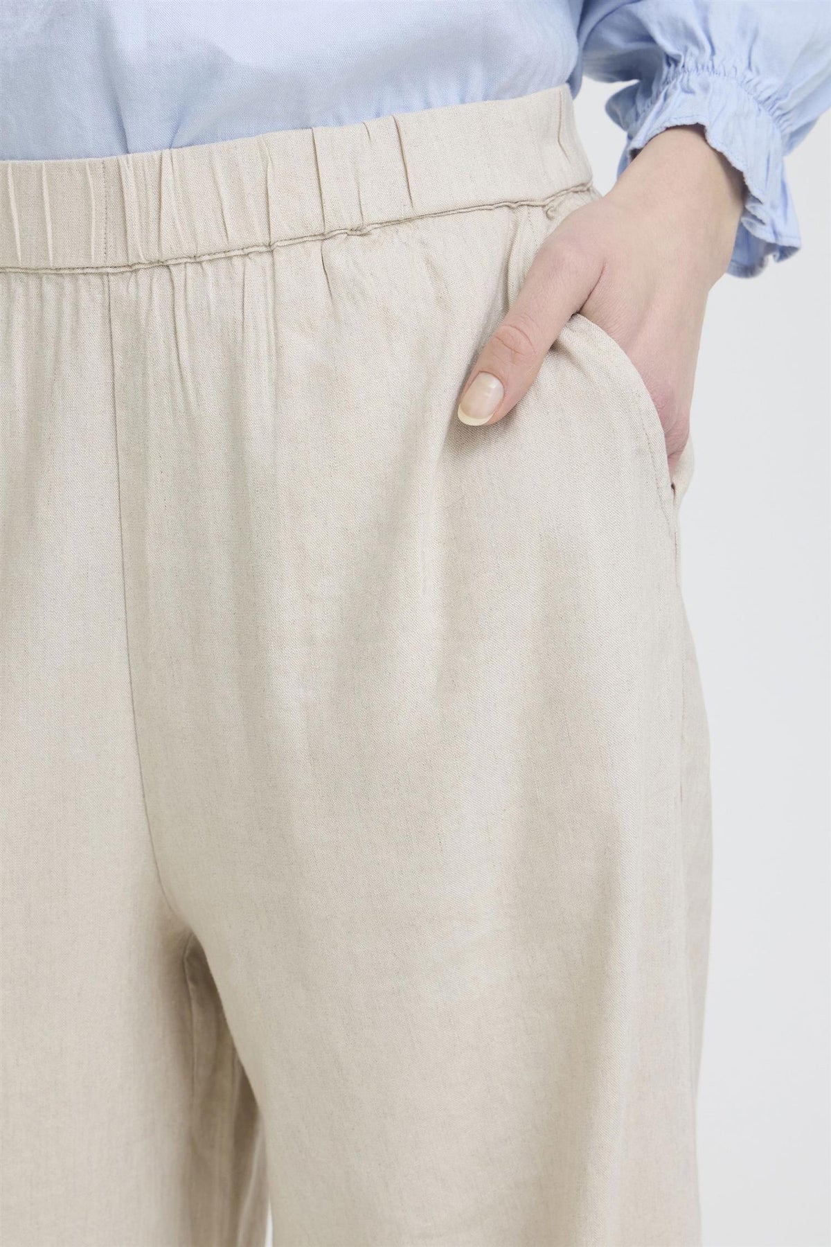 Materiale: 52% Lin, 45% Viskose, 3% Elastan - Lin gir en lett og pustende kvalitet, mens viskose tilfører mykhet og glans. Elastan gir fleksibilitet og komfort.