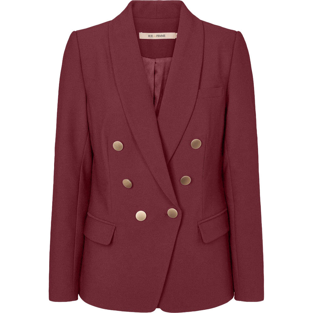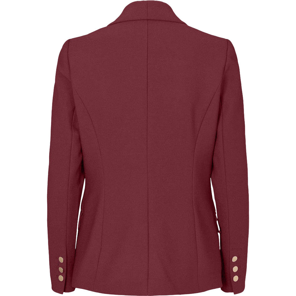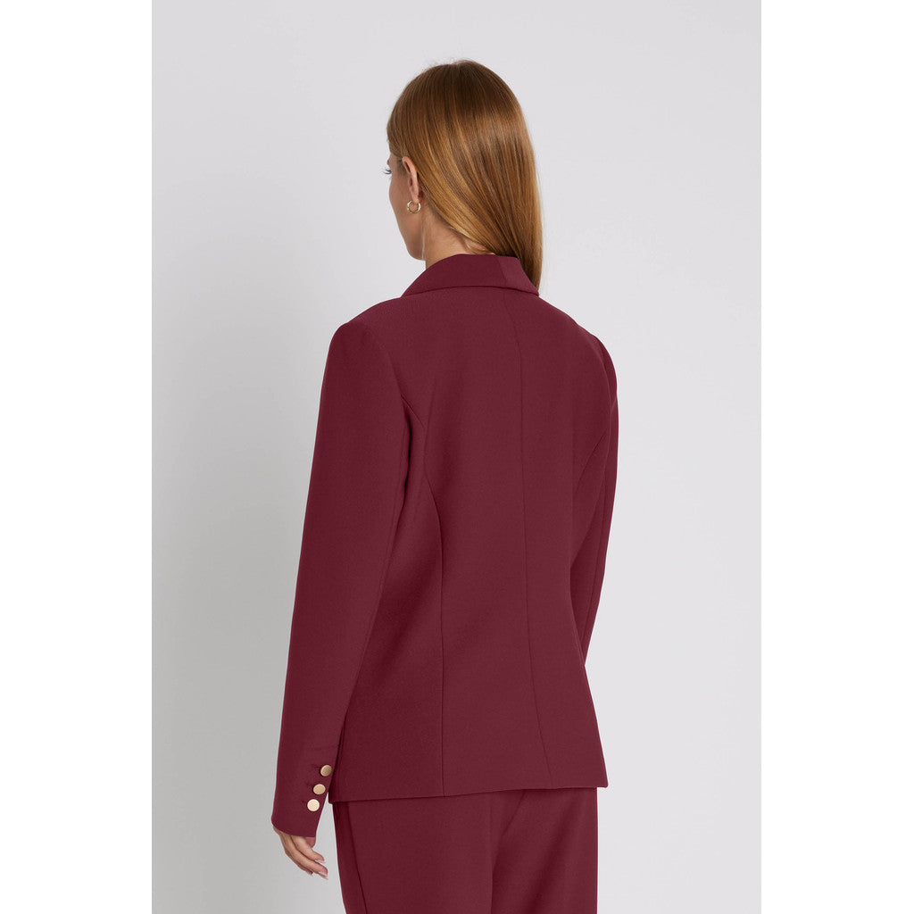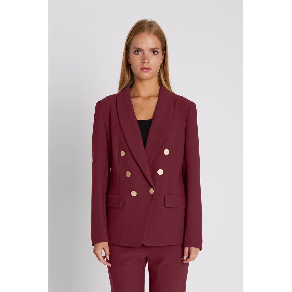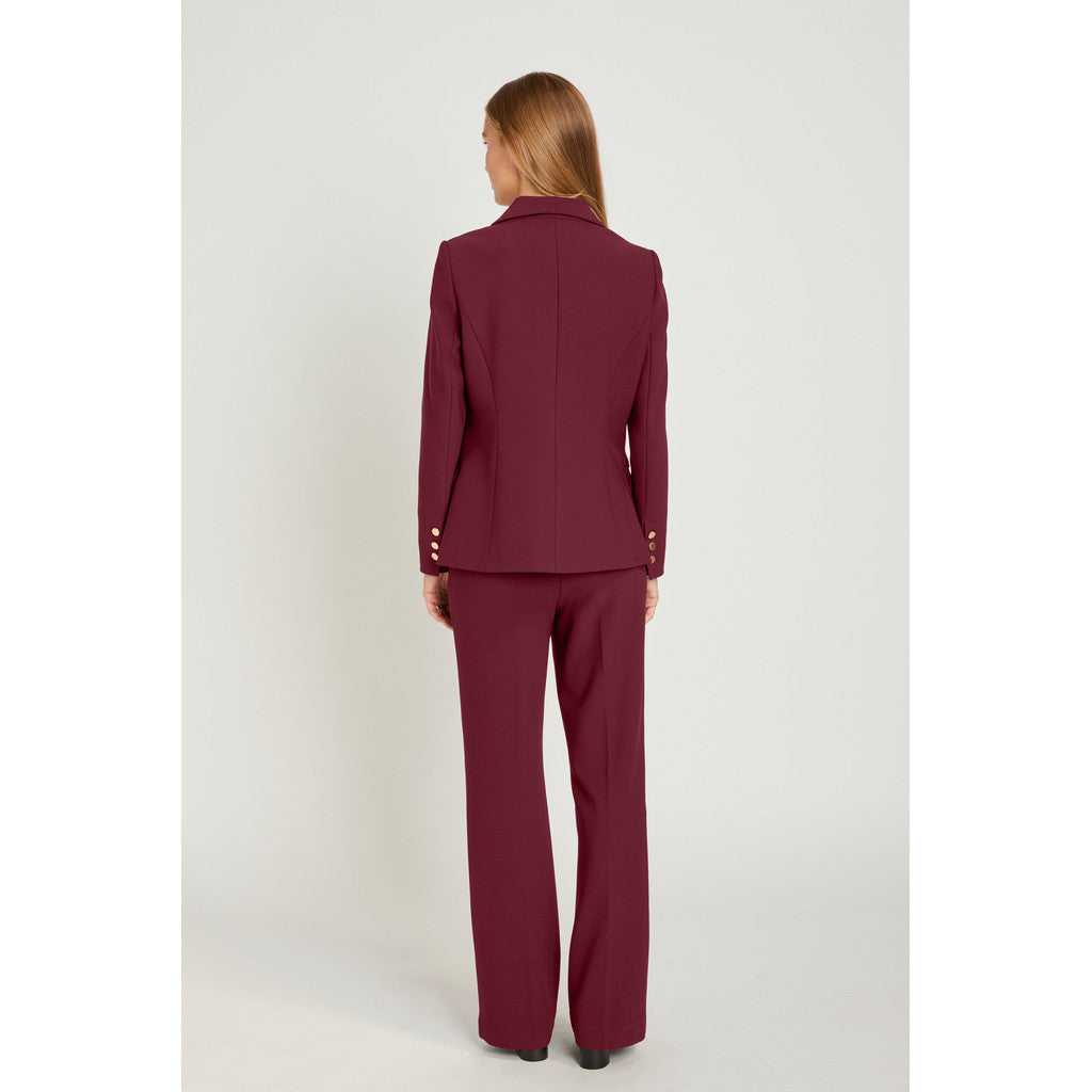 Flottblazer i høstens løkre burgunder fargen. Jakken er dobbelspendt med gull knapper og svakt avrundet nederst. Jakken er foret. Bukse hører til.