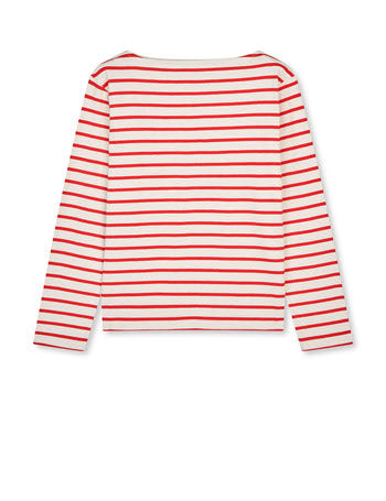 Genseren har en lett båthals og striper. Vid modell.