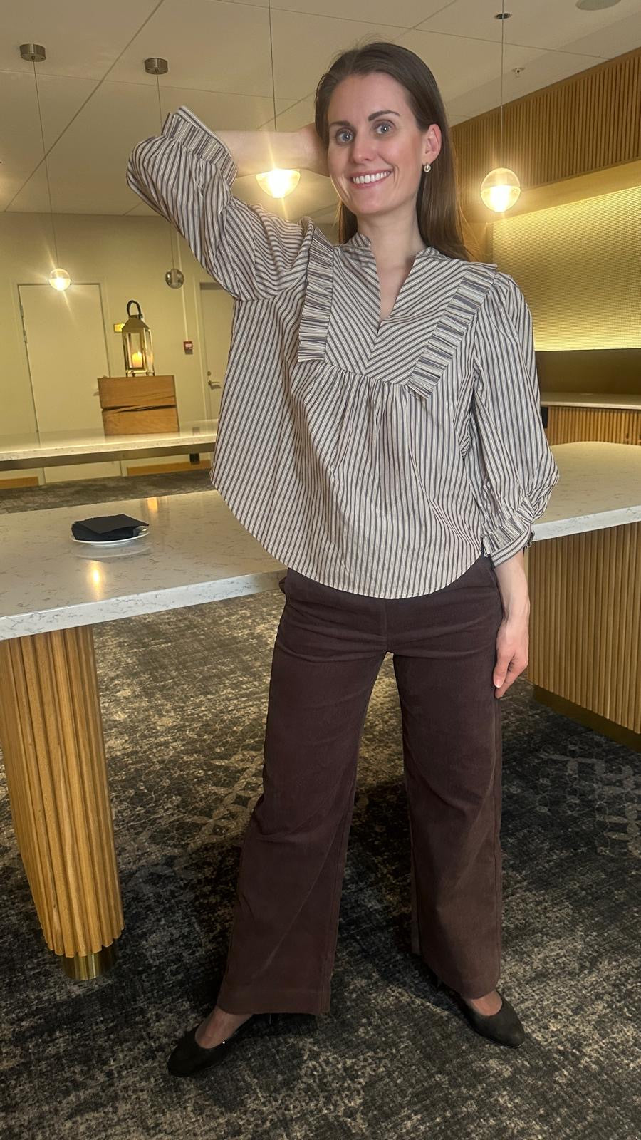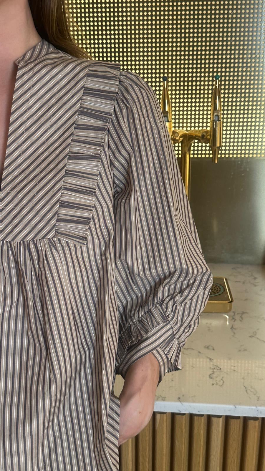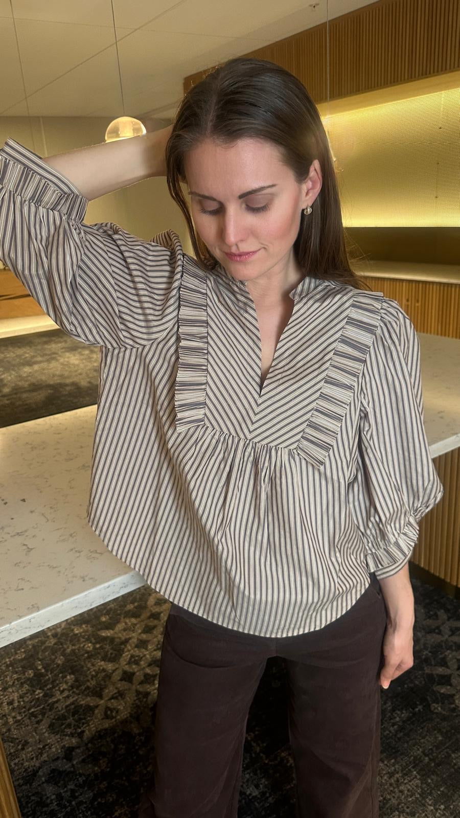 Lys brun bluse med striper og rysjer. Rund hals med V åpning og 3/4 ermer.