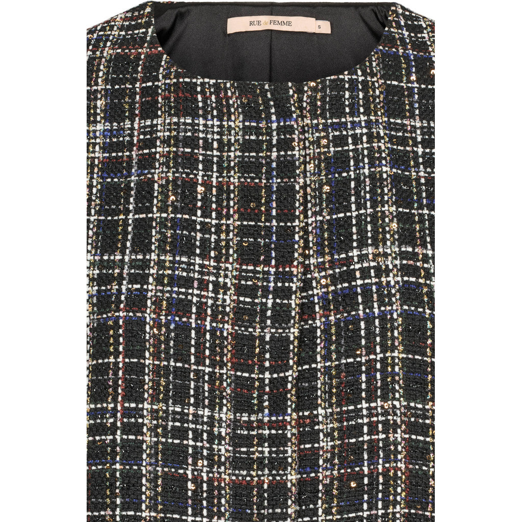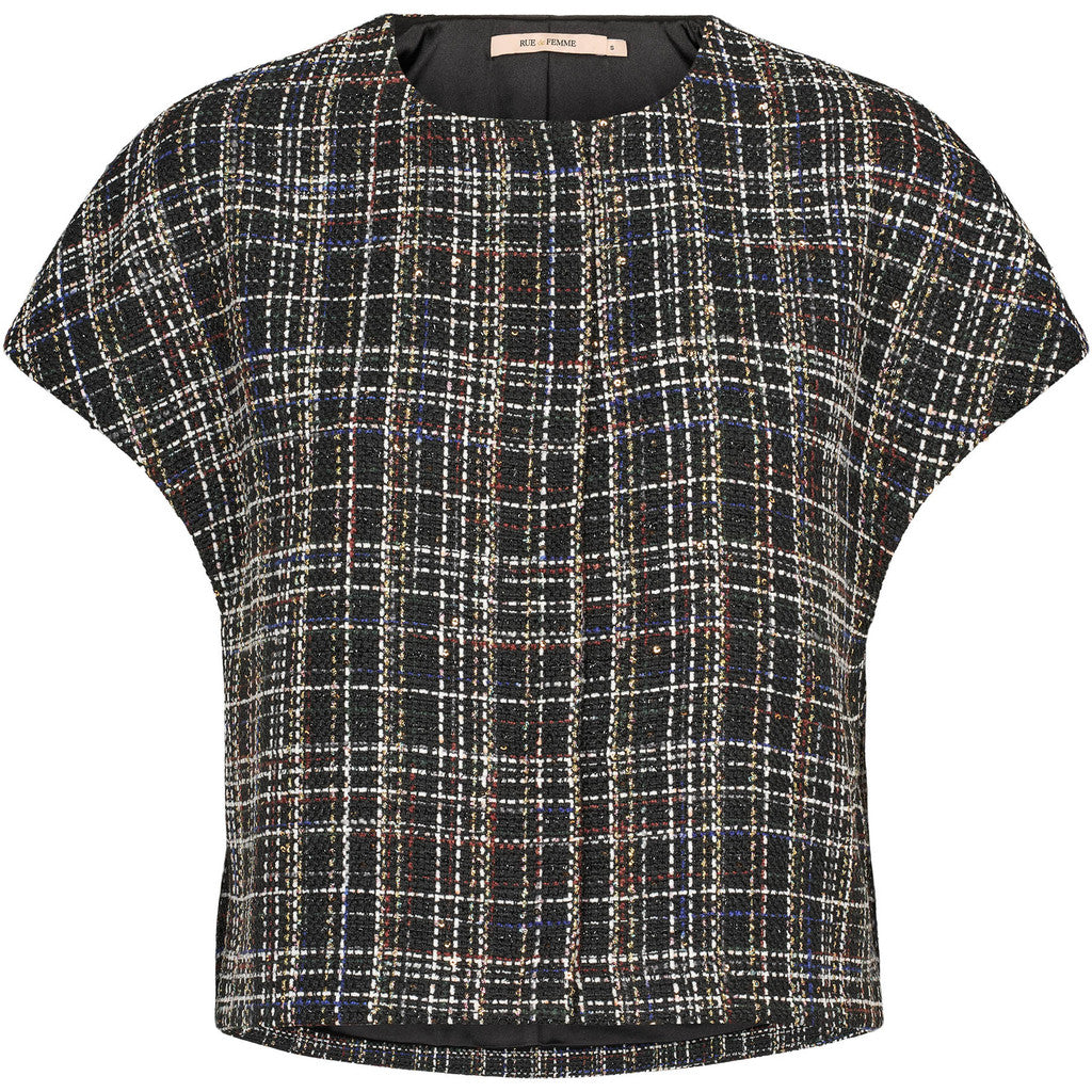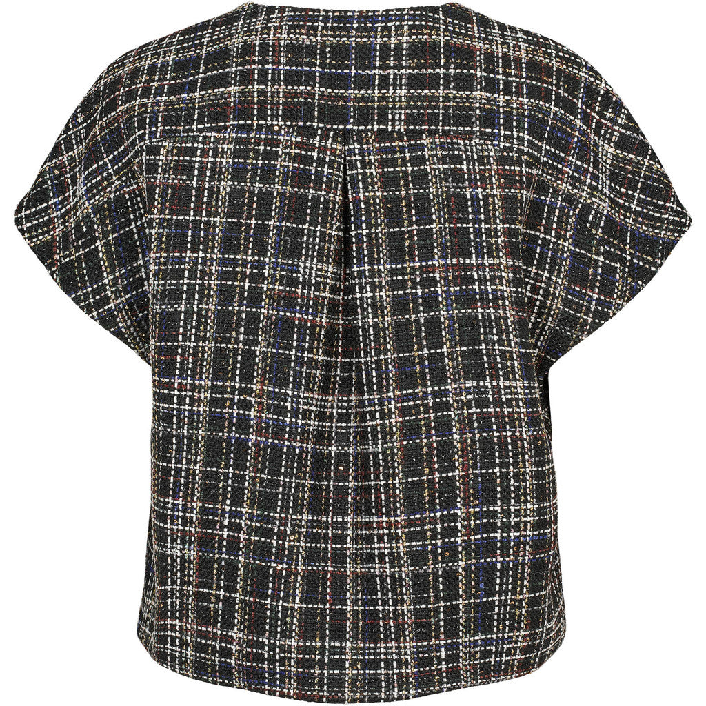 Tøff vest med ruter og gull tråder i stoffet. Vesten har rund hals og lukkes med trykknapper.