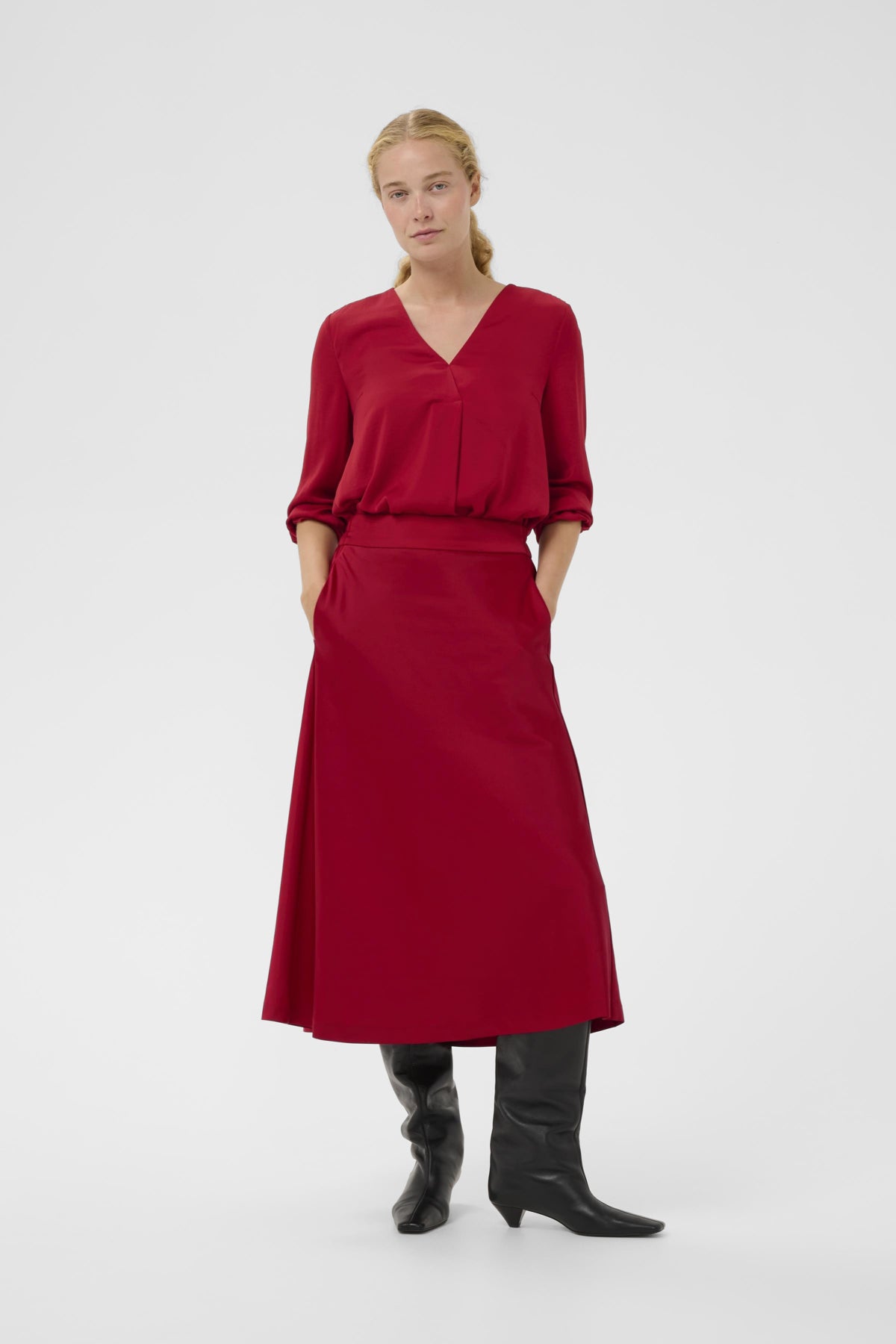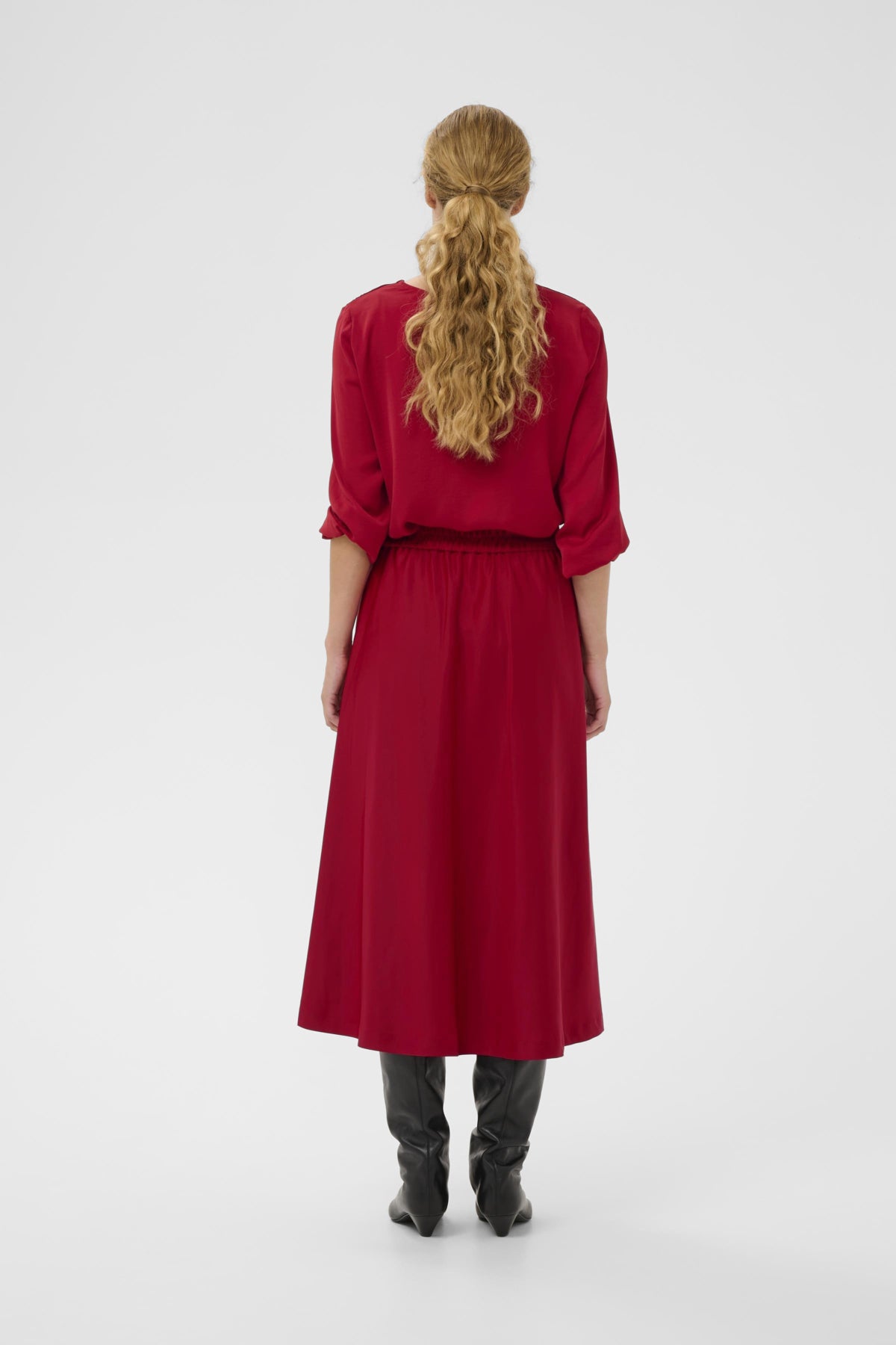 Skjørtet har strikk i livet bak og lommer i sidesømmen.
