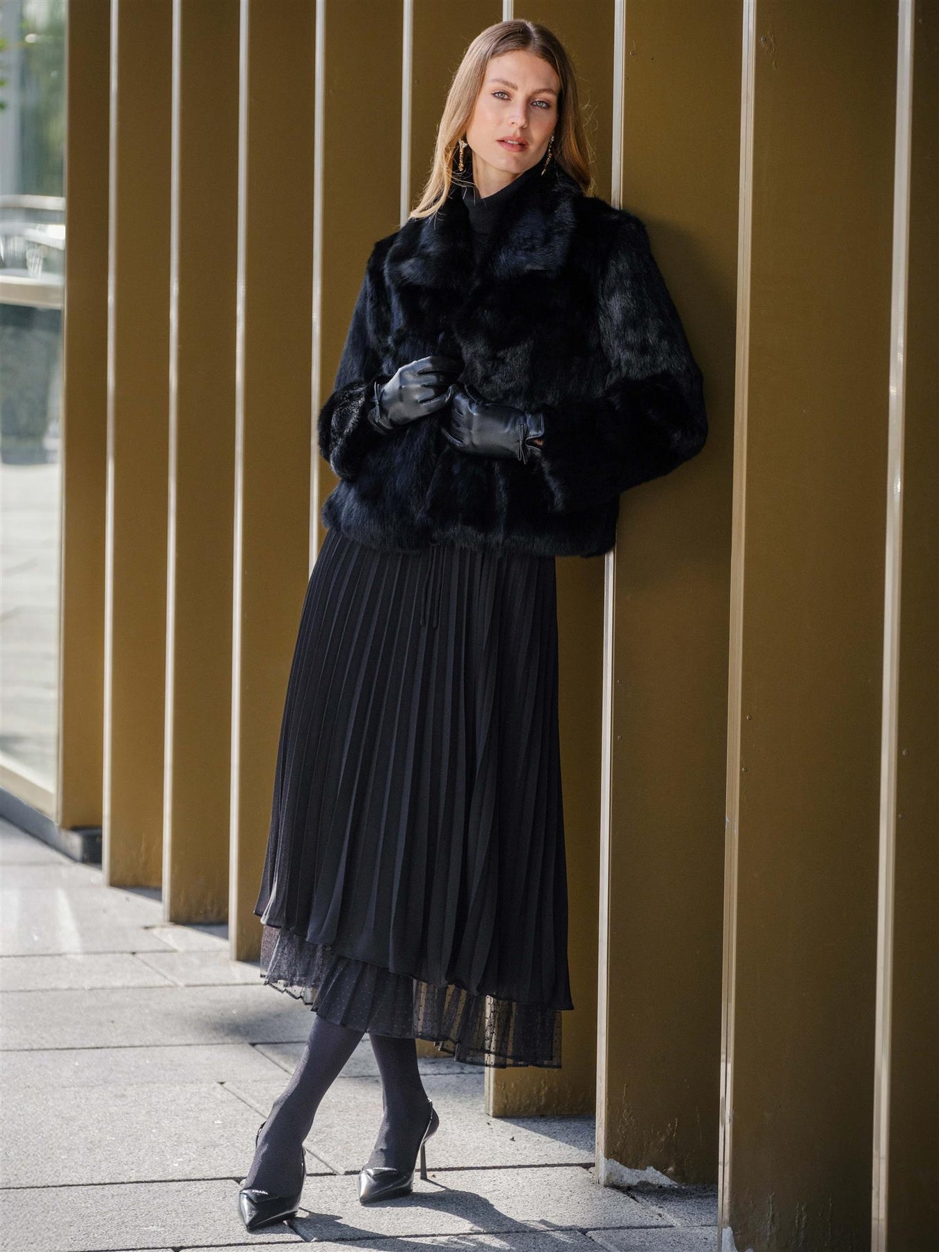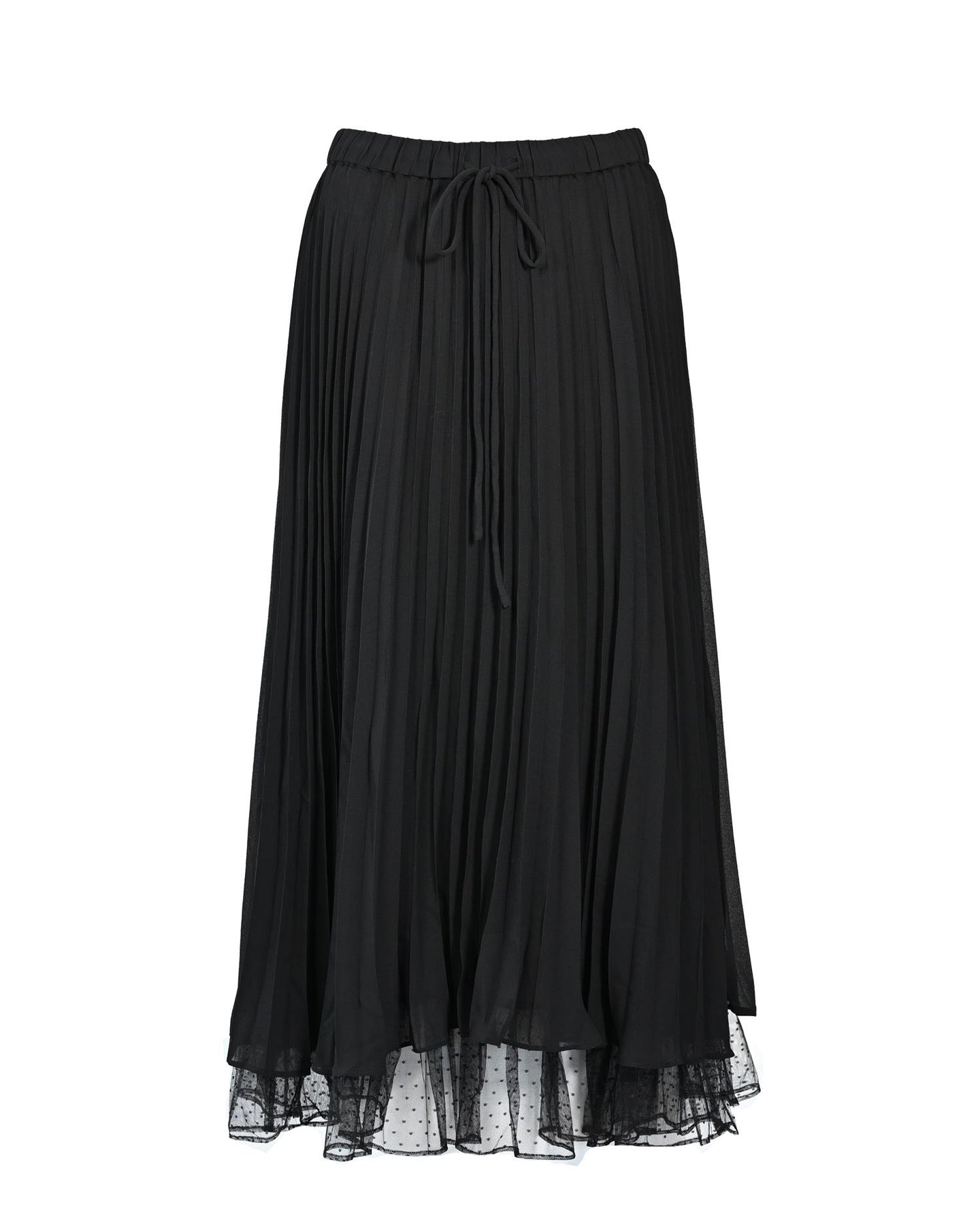 Langt plisse skjørt med vidde nederst. Skjørtet har strikk i livet me dsnor. God passform og stretch. Skjørtet er foret og har en lten tyll kant nederst.