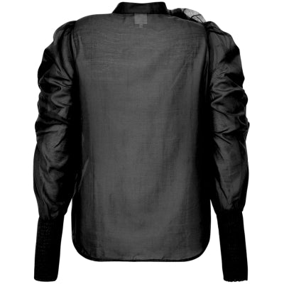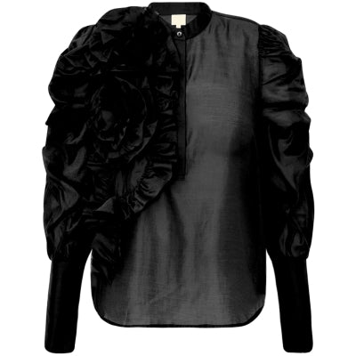 Romantisk bluse med rund hals og skjult knapping til brystet. Blusen har lang erm med folder på så de blir litt volumiøse. Lekre stoff blomster langs brystet på høyre side.
