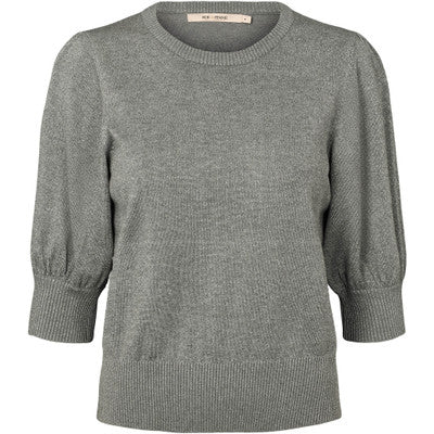 Nydelig strikket genser med sølvtråder3/4 lang erm og puff ved skulder