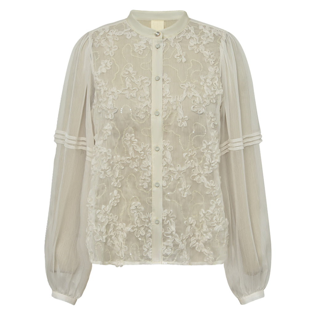 Lekker tynn chiffong bluse med rund hals og lekre blomster på fremstykket.