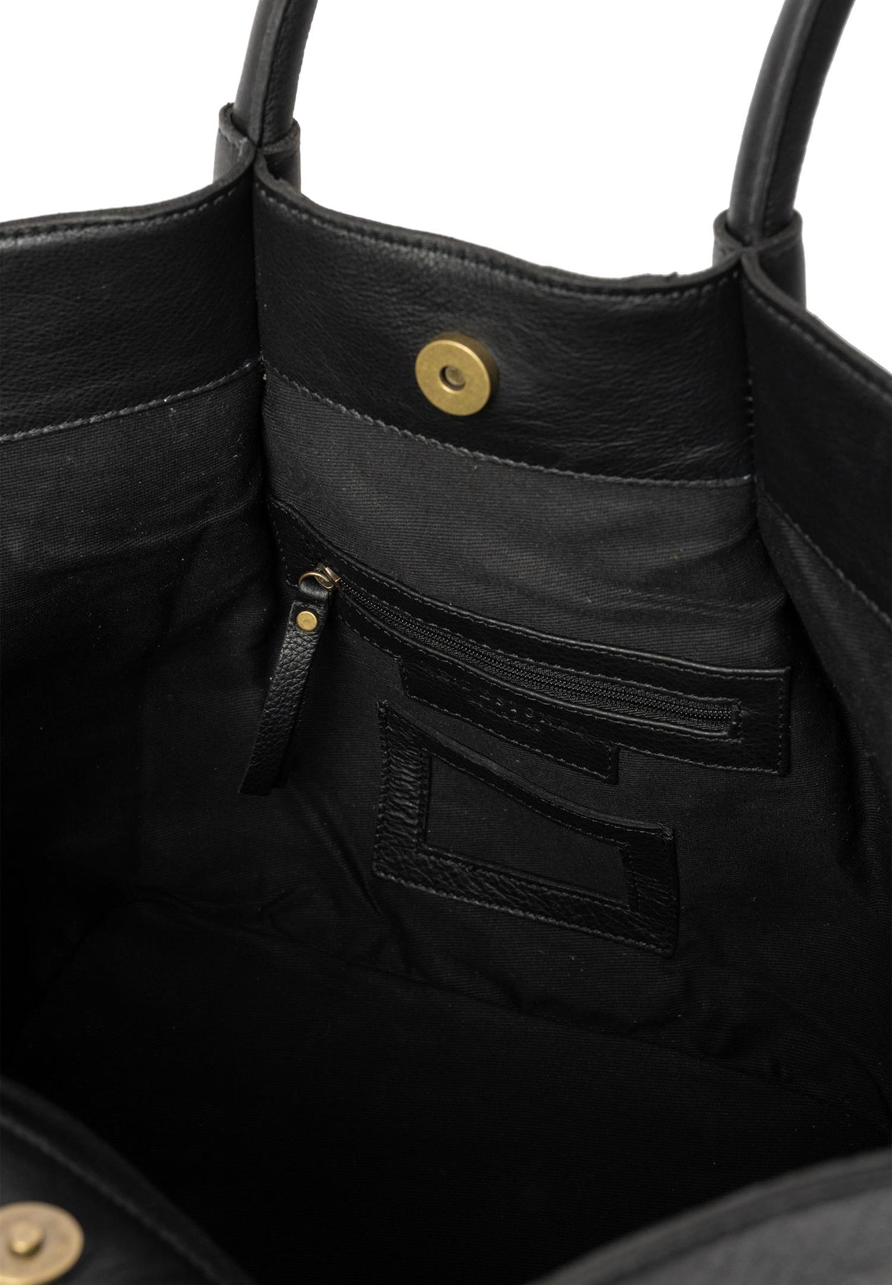 Glidelås lomme inni og 2 åpne lommer. Vesken lukkes med trykknapp.