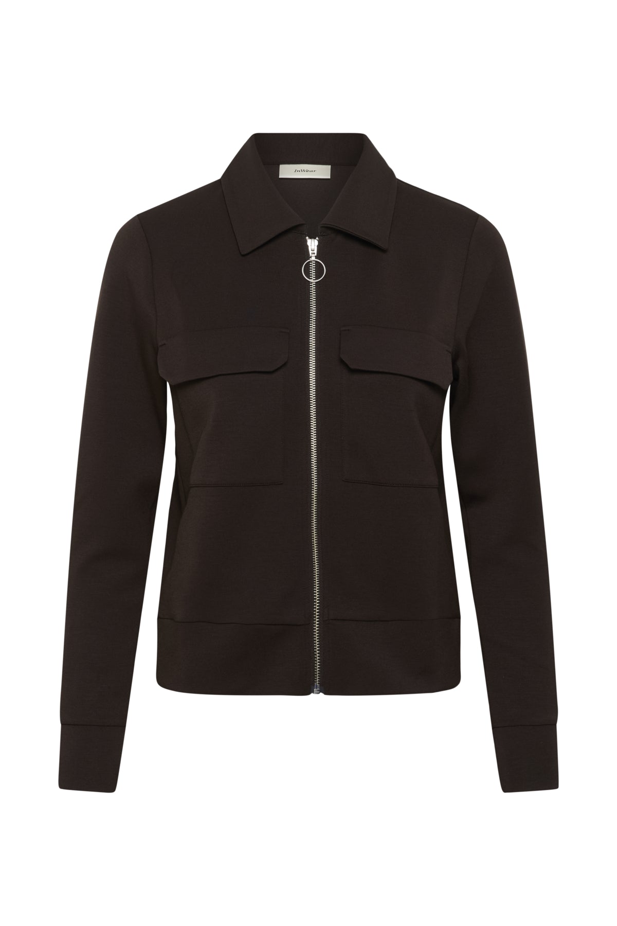 En tøff cardigan med glidelås og krage. Utenpåsatte lommer foran.